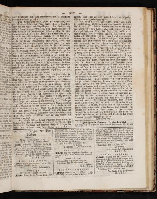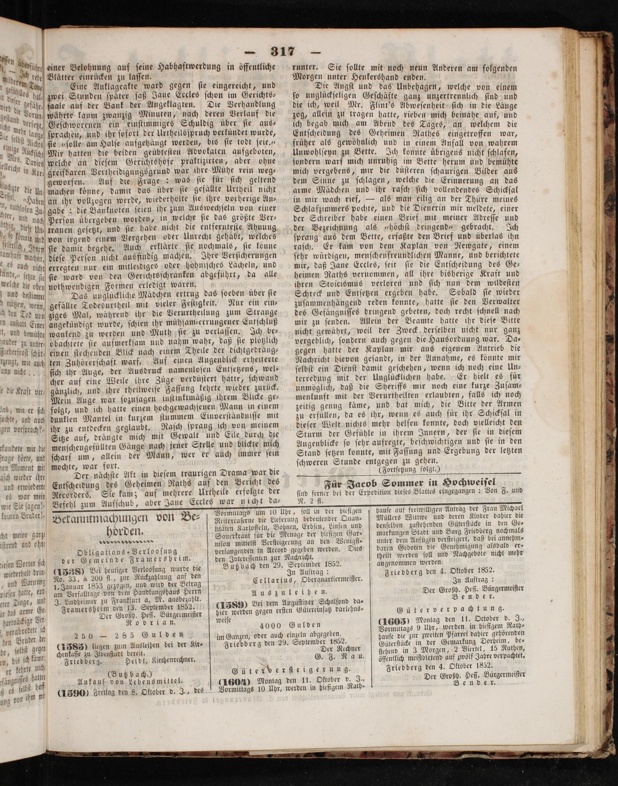 (1588) Bei heutiger Verlooſung wurde die No. 33, à 200 fl., zur Rückzahlung auf den 1. Januar 1853 gezogen, und wird der Betrag am Verfalltage von dem Handlungshaus Herrn J. Lindheimer zu Frankfurt a. M. ausbezahlt. Framersheim den 13. September 1852. Der Großh. Heſſ. Bürgermeiſter Rodrian.