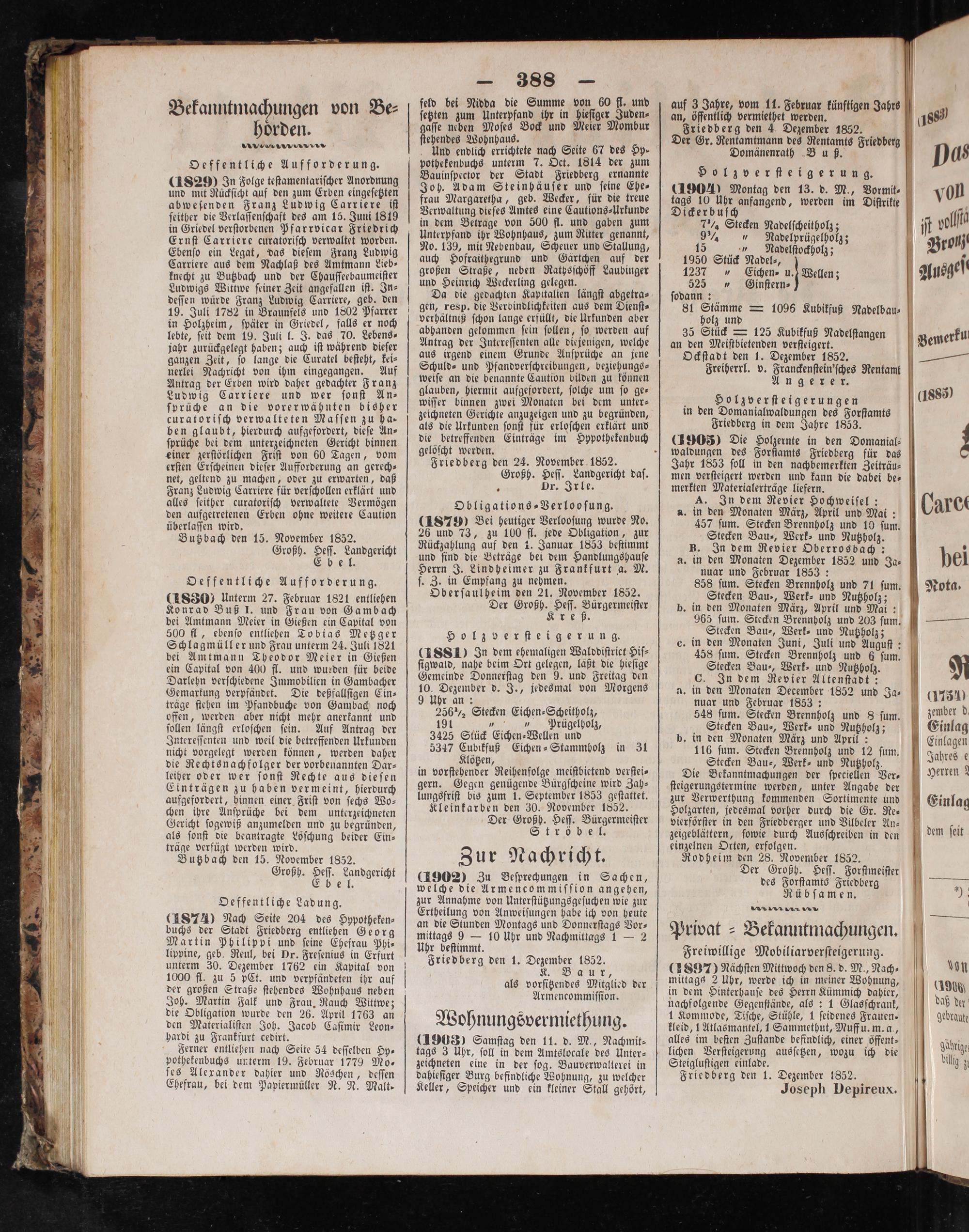 Steigluftigen einlade. Friedberg den 1. Dezember 1852. Joseph Depireux.