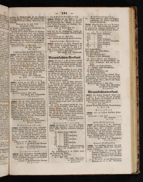 Der Preiß der Braunkohlen iſt gegen früher ermäßigt und beträgt bis auf Weiteres für die von Reihen und Haufen 11 Kreuzer per Ctr., für die aus den Schoppen 12 Kreuzer per Etr. und für die ſog. Holzkohlen 14 Kreuzer per gemeſſenen Centner. 14 Stück Klötze werden für einen Centner gerechnet.