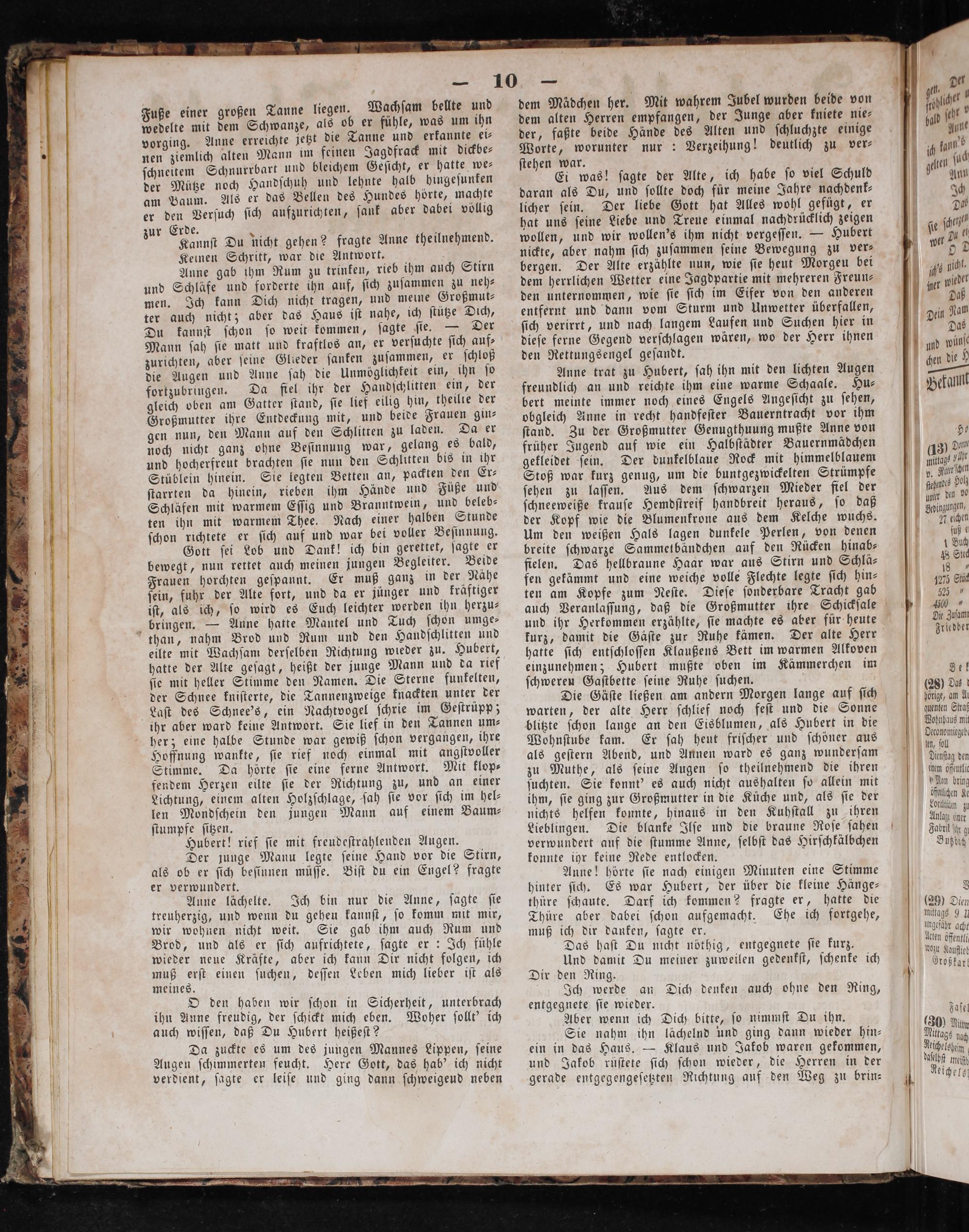 Gott ſei Lob und Dank! ich bin gerettet, ſagte er bewegt, nun rettet auch meinen jungen Begleiter. Beide Frauen horchten geſpannt. Er muß ganz in der Nähe ſein, fuhr der Alte fort, und da er jünger und kräftiger iſt, als ich, ſo wird es Euch leichter werden ihn herzu- bringen.— Anne hatte Mantel und Tuch ſchon umge- than, nahm Brod und Rum und den Handſchlitten und eilte mit Wachſam derſelben Richtung wieder zu. Hubert, hatte der Alte geſagt, heißt der junge Mann und da rief ſie mit heller Stimme den Namen. Die Sterne funkelten, der Schnee kniſterte, die Tannenzweige knackten unter der Laſt des Schnee's, ein Nachtvogel ſchrie im Geſtrüpp; ihr aber ward keine Antwort. Sie lief in den Tannen um⸗ her; eine halbe Stunde war gewiß ſchon vergangen, ihre Hoffnung wankte, ſie rief noch einmal mit angſtvoller Stimme. Da hörte ſie eine ferne Antwort. Mit klop⸗ fendem Herzen eilte ſie der Richtung zu, und an einer Lichtung, einem alten Holzſchlage, ſah ſie vor ſich im hel— len Mondſchein den jungen Mann auf einem Baum— ſtumpfe ſitzen.