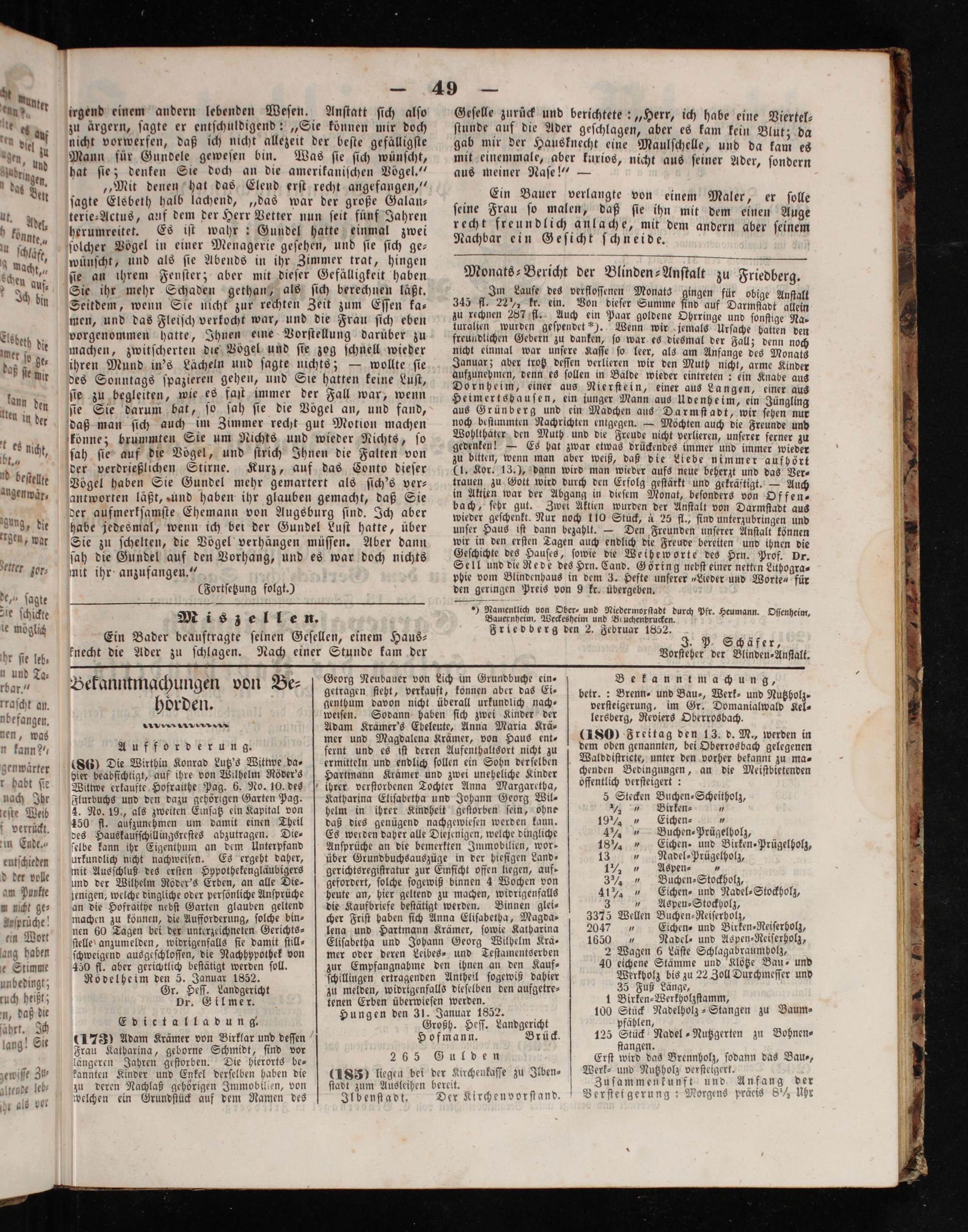 Friedberg den 2. Februar 1852. J. P. Schäfer, Vorſteher der Blinden⸗Anſtalt.