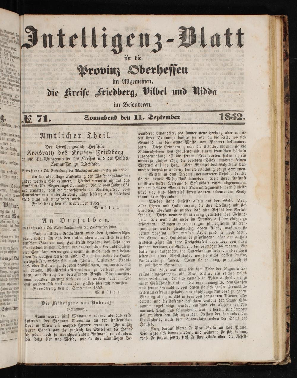 eich oder Belgien zu begeben beabſichtigen, anzuweiſen, ſich nit Großh. Miniſterial⸗Reiſepäſſen zu verſehen, welche 9 ihnen, auf Antrag der betreſſenden Großh. Bürgermeiſter, merh mmuthshalber unentgeltlich ertheilt werden ſollen. Sie aum cabmen fabſt werden ſich vorkommenden Falles hiernach bemeſſen. Friedberg den 5. September 1852. Mie ble r.