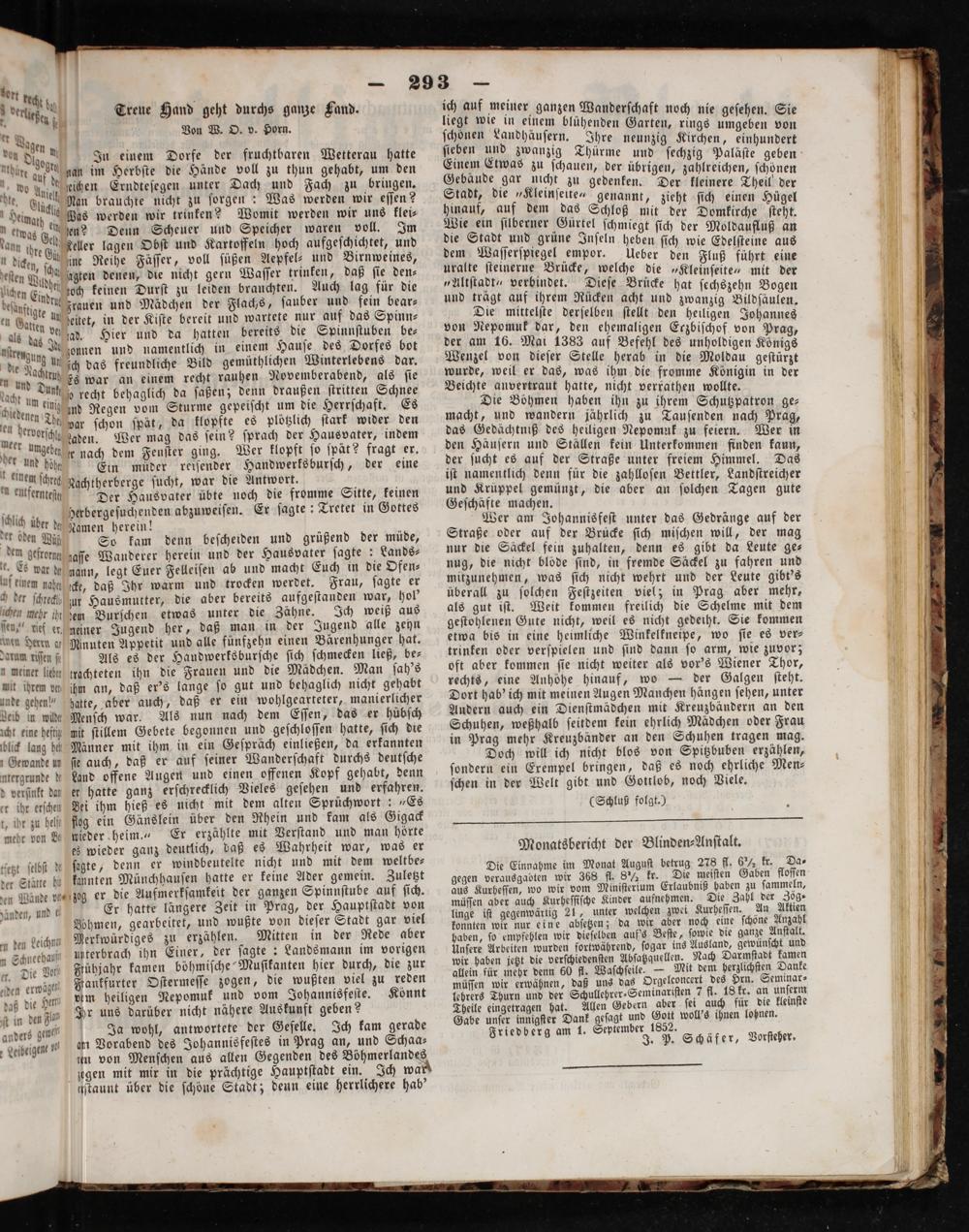 . etwas 6 ann ihre Gu 1 dicken 1 f 7 ſchqh zeſten Wudheſ f 5 lichen Eine och keinen Durſt zu leiden brauchten. deftige dun frauen und Mädchen der Flachs, ſauber und fein bear⸗ en Sun un eitet, in der Kiſte bereit und wartete nur auf das Spinn⸗ u ve. i del ſad. Hier und da. M zonnen und namentlich in einem Hauſe des Dorfes bot die Nacht un ich das freundliche Bild gemüthlichen Winterlebens dar. en und— Es war an einem recht rauhen Novemberabend, als ſie dacht un a recht behaglich da ſaßen; denn draußen ſtritten Schnee chiedenen au ind Regen vom Sturme gepeiſcht um die Herrſchaft. Es ien herdo Te par ſchon ſpät, da klopfte es plötzlich ſtark wider den meer mmh aden. Wer mag das ſein? ſprach der Hausvater, indem ber n ir nach dem Fenſter ging. Wer klopft ſo ſpät? fragt er. ** höhe Ein müder reiſender Handwerksburſch, der eine — in ſchre Rachtherberge ſucht, war die Antwort. ufernteſig Der Hausvater übte noch die fromme Sitte, keinen ſolich ib Herbergeſuchenden abzuweiſen. Er ſagte: Tretet in Gottes 10 der n Namen herein! 5 der oden Miß So kam denn beſcheiden und grüßend der müde, n gefrorn zaſſe Wanderer herein und der Hausvater ſagte: Lands⸗ „ Es war zu nann, legt Euer Felleiſen ab und macht Euch in die Ofen⸗ uuf einem nab icke, daß Ihr warm und trocken werdet. Frau, ſagte er c der ſchrec, zur Hausmutter, die aber bereits aufgeſtanden war, hol' chen mehr inn dem Burſchen etwas unter die Zähne. Ich weiß aus ſeus“ kiefer, neiner Jugend her, daß man in der Jugend alle zehn en eren a, Minuten Appetit und alle fünfzehn einen Bärenhunger hat. datum riſen ſi Als es der Haudwerksburſche ſich ſchmecken ließ, be⸗ i meiner lihn trachteten ihn die Frauen und die Mädchen. Man ſah's ut ihrem o ihm an, daß er's lange ſo gut und behaglich nicht gehabt ande gehen!“ hatte, aber auch, daß er ein wohlgearteter, manierlicher Veib in wibn Menſch war. Als nun nach dem Eſſen, das er hübſch icht eine heft mit ſtillem Gebete begonnen und geſchloſſen hatte, ſich die blick lang hs Männer mit ihm in ein Geſpräch einließen, da erkannten Gewande un ſie auch, daß er auf ſeiner Wanderſchaft durchs deutſche ntergrunde d Land offene Augen und einen offenen Kopf gehabt, denn d verſinkt day er hatte ganz erſchrecklich Vieles geſehen und erfahren. er ihr erſchen Bei ihm hieß es nicht mit dem alten Sprüchwort:„Es „ h zu hell fog ein Gänslein über den Rhein und kam als Gigack mehr von W wieder heim.“ Er erzählte mit Verſtand und man hörte es wieder ganz deutlich, daß es Wahrheit war, was er etzt ſelbſt n ſagte, denn er windbeutelte nicht und mit dem weltbe⸗ der Stätte h kannten Münchhauſen hatte er keine Ader gemein. Zuletzt en Wände vos zog er die Aufmerkſamkeit der ganzen Spinnſtube auf ſich. händen, und el Er hatte längere Zeit in Prag, der Hauptſtadt von Böhmen, gearbeitet, und wußte von dieſer Stadt gar viel