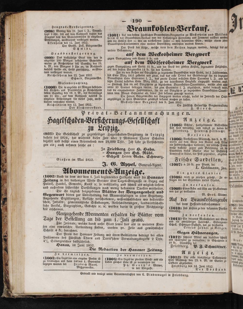Gedruckt und verlegt unter Verantwortlichkeit von C. Binderna gel in Friedberg.