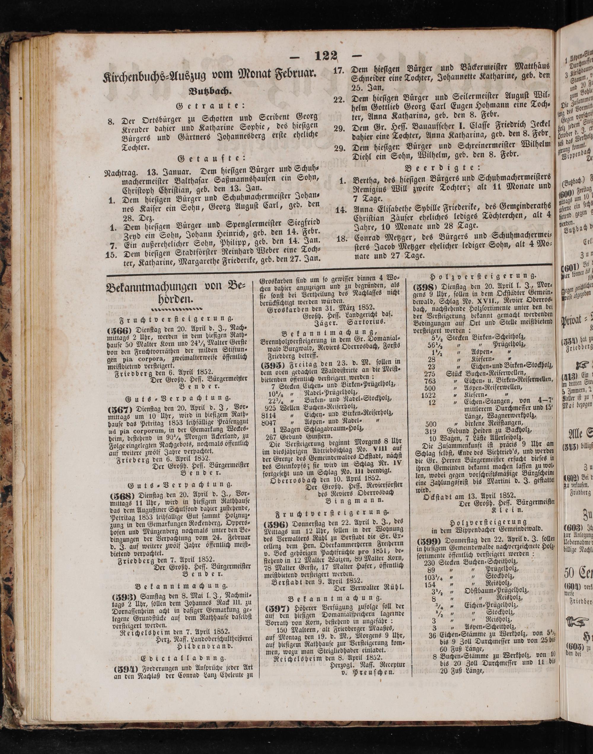 (567) Dienſtag den 20. April d. I, Vor⸗ mittags um 10 Uhr, wird in hieſigem Rath⸗ bauſe das Petritag 1853 leihfällige Präſenzgut ad pia corporum, in der Gemarkung Weckes⸗ heim, beſtehend in 90/ Morgen Ackerland, zu Folge eingelegten Nachgebots, nochmals öffentlich auf weitere zwölf Jahre verpachtet. Frieberg den 6. April 1852. Der Großh. Heſſ. Bürgermeiſter Bender.