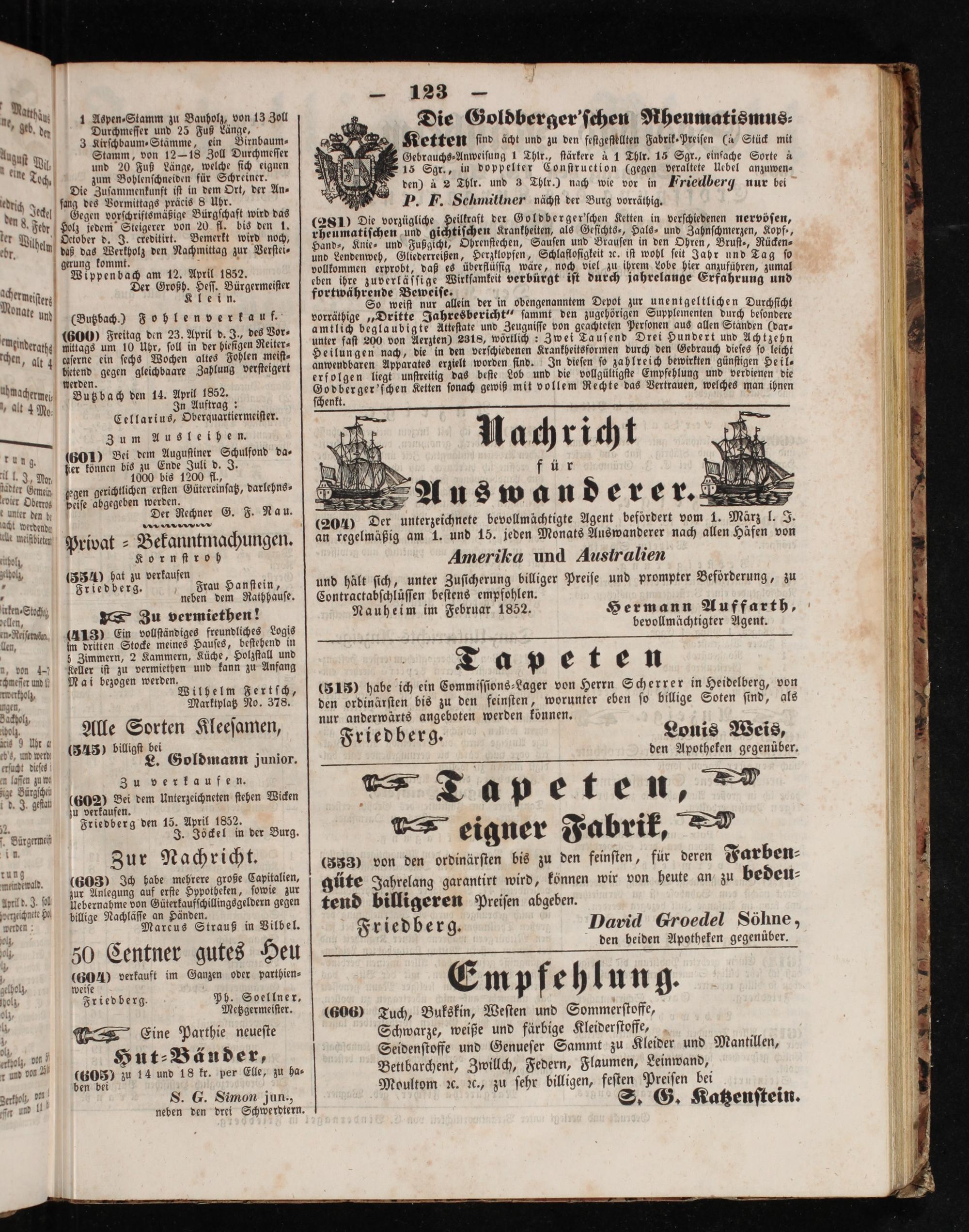 un:(38) biligft bei Friedberg. Louis Weis, 1 L. Goldmann junior. den Apotheken gegenüber.