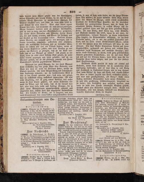 (19320 Da von verſchiedenen Seiten uns geäußert worden iſt, daß man von der dahier beſtehenden Schuhmacher⸗Leichengeſellſchaft nichts wiſſe, veranlaßt uns folgendes zu veröffentlichen. Bemerkte Leichenkaſſengeſellſchaft beſteht ſchon über 70 Jahre und wurde zur Zeit der Grün⸗ dung beſtimmt, daß bei Sterbefällen, ſowohl männlich als weiblich, 12 fl. bezahlt werden ſollten, das Sterbfällegeld iſt aber bis jetzt ge⸗ ſtiegen und feſtgeſetzt auf 30 fl. à Perſon, und trotz dieſer bedeutenden Erhöhung hat die Kaſſe einen Kapitalſtock von 900 fl. errungen. Diejenigen hieſigen Ortsbürger, welche ge⸗ ſonnen ſind Mitglied dieſer Geſellſchaft zu wer⸗ den, wollen ſich an den unterzeichneten Vorſtand wenden, welcher gerne bereit iſt, die näheren ſtatutengemäße Bedingungen vorzulegen. Friedberg den 6. Dezember 1852. Der Vorſtan d: Faatz. Jakob Wien. H. Waas. Johannes Rückert.