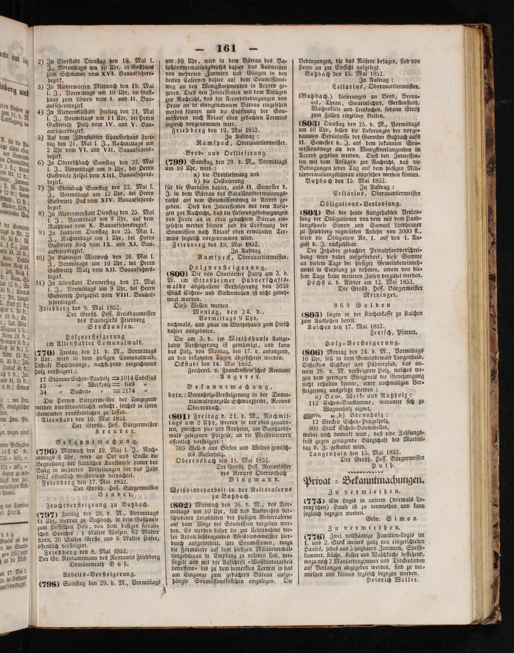 Burg in mehreren Abtheilungen für das Jahr 1852 öffentlich meiſtbietend verpachtet. Friedberg den 17. Mai 1852. Der Großh. Heſſ. Bürgermeiſter Be n. d g erf