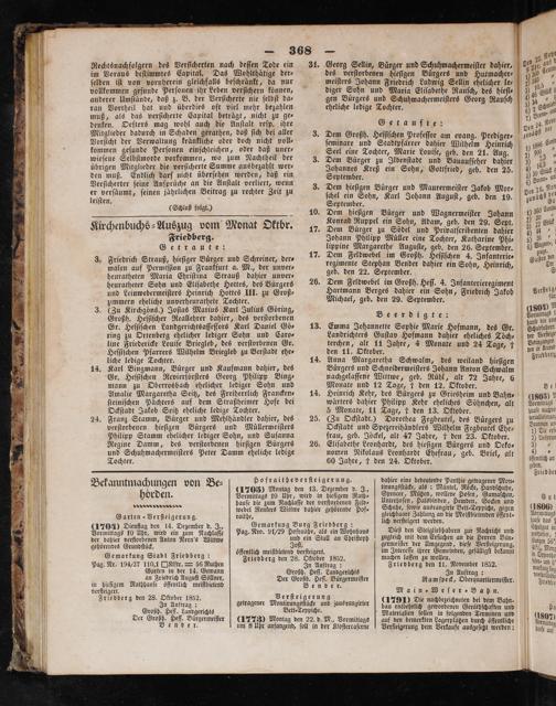 — 368— Rechtsnachfolgern des Verſicherten nach deſſen Tode ei g N Lab. 0 5 N ode ein 5 i 5 5„ im Voraus beſtimmtes Capital, Das Wohlthätige der⸗. 9285 1 5 Bürger und Schuhmachermeiſter dahier, 15 gan benen i uc rnſreuf ge ans bosch i pur 1 hieſigen Bürgers und Hutmacher⸗ 5 30 Erni vollkommen geſunde Perſouen ihr Leben verſichern können, diger Sohn 5. Ludwig Sellin ehelicher le⸗ 30,„ anderer Ulmſtände, daß z. B. der Verſicherte nie ſelbſt da⸗ a Virgen a 8956 Eliſabethe Rauſch, des hieſi⸗ 086 ran Vortheil hat und überdies oft viel mehr bezahlen eheliche ledi e T eee 9* muß, als das verſicherte Capital beträgt, nicht zu ge⸗ e 0 2 eh denken. Oefters mag wohl auch die Anſtalt reſp. ihre G 1 Bun. Mitglieder dadurch in Schade 1 nee bt en gerathen, daß ſich bei aller 3. Dem G Oen 24 per Vorſicht der Verwaltung kränkliche oder doch nicht voll⸗ 1 em Großh. Heſſiſchen Profeſſor am evang. Prediger⸗ zunägſß 1 kommen geſunde Perſonen einſchleichen, oder daß uner⸗ Se und Stadtpfarrer dahier Wilhelm Heinrich 880 Een wieſene Selbſlmorde vorkommen, wo zum Nachtheil der 3 Sen eine Tochter, Marie Louiſe, geb. den 21. Aug 1 900„ übrigen Mitglieder die verſicherte Summe ausbezahlt wer⸗* Bürger zu Ilbenſtadt und Bauaufſeher dahier 5 1 den muß. Endlich darf nicht überſehen werden, daß ein Johannes Kreß ein Sohn, Gottfried, geb. den 25. eue Verſicherter ſeine Anſprüche an die Anſtalt verliert, wenn eee 190 1 er verſäumt, ſeinen jährlichen Beitrag zu rechter Zeit zu 3. Dem hieſigen Bürger und Maurermeiſter Jak J. leiſten. ſchel ein Sohn Karl Johann 2 Ja ob Mor⸗ Den 26. Nor (Schluß folgt.) September. 0 uguſt, geb. den 19. räcſ g 5 3 10. Dem hieſigen Bürger und g 0 Cenin Friedberg. ee eee e Södel und Privatſcribenten dahier 1 ohen 11 8 41* 6 1 5 e ehe Aue. Katharine Phi⸗ 9 5 3. Friedrich Strauß, hieſiger Bürger und Schreiner, der⸗ 17. Dem Feldwebel im Großh. Heſſſchen 25 Ben Je malen auf Permiſſion zu Frankfurt a. M., der unver⸗ regimente Stephan Bender dahier ein Sohn, i rich, Cite ge fact Ser ae aide e dee ee, de ee en. ö iſabethe Hottes, des Bü Dem Feld i e und Leinwebermeiſters Heinrich Hottes III. zu Gioß⸗ Sarnen 0g dahier N 85 e een, i zimmern eheliche unverheurathete Tochter. Michael, geb. den 29. Se 1 b e ee auf 3.(Zu Kirchgöns.) Joſias Marius Karl Julius Göring, e e 1 . e ee des verſtorbenen Beer digte: Gade Yr. iſchen Landgerichtsaſſeſſors Karl Daniel Gö⸗ 13. E J j; die von ng zu Ortenberg ehelicher lediger Sohn und Caro, ee Sophie Marie Hofmann, des Gr. Egal line Friedericke Louiſe Briegleb, des verſtorbenen Gr. terchen, alt 11 8 v» Hofmann dahier eheliches Töch⸗ dr Bafſg 781 17 Wülhelm Briegleb zu Berſtadt ehe⸗ N e Jahre, 4 Monate und 24 Tage, f 1 h he ledige Tochter. 14. A g 5 1 14. Karl Bingmann, Bürger und Kaufmann dahier, d„Hana WMargereiha, Schwalm, is weiland e es 5 e hieſigen Gr. Heſſiſchen Revierſörſters Georg Phili 3 Dürgeſe and Hanete weiter Jian Amen Wan r ö g Philipp Bing nachgelaſſene Wittwe, geb mann zu Oberrosbach ehelicher lediger Sohn und Monate und 12 Tage 145% 4% e Amalie Margaretha Seitz, des Freiherrlich Francken⸗ 14. Heinrich Kehr des den 12. Oktober. Be ſteiniſchen Paͤchters auf dem Straßheimer Hofe bei wärters dahier Phili ürgers zu Griesheim und Bahn.(1803) 5 Ockſtadt Jakob Seitz eheliche ledige Tochter. 5 Monate, 11 5 ipp Kehr eheliches Söhnchen, alt Vormiags 24. Franz Stamm, Bürger und Mehlhändler dahier, des 25. Zu Ockſtadt or ben 1, er hause nachoe verſtorbenen hieſigen Bürgers und Müllermeiſters Ockſtadt and S orotheg Fegbeutel, des Bürgers zu mae Philipp Stamm ehelicher lediger Sohn, und Suſanna frau, geb i Wilhelm Fegbeutel Ehe⸗ 0 Dee af Regine Damm, des verſtorbenen hieſigen Bürgers 256. Eſtperſe Leue e und Schuhmachermeiſters Peter Damm eheliche ledige nomen Nikol B Tochter. 515 ikolaus Leonhardt Ehefrau, geb. Briel, alt 43 Jahre, 1 den 24. Oktober. 1 öffentlich an eben. Bekanntmachungen. Hofraitheverſtei N be 7 von Be⸗ 47080 den 5 1 5 e getragener Mon⸗ en. Vormittags 10 Uhr, wird in hieſigem Rath[ Spencer, Mützen, w 1 5 N Handſchuhe, eee 1105 die zum Nachlaſſe der verſtorbenen Feld: Anterboſen, Halsbinden, 1 Socken iu Aut Garten⸗Verſteigerung. raithe Renkers Wittwe dahier gehörende Hof⸗ A ſowie ausrangirte Bett⸗Teppiche, gegen(1806) (170) Dienſtag de 4 5 gleichbaare Zahlung an die Meiſtbietenden öffent- Vormittags Vormittags 10 97 e e 15 9 i Friedberg: lich verſteigert werden. Nause das l„ um Nachlaſſe ag. Nro. 91/29 Hofraithe, als ein Wohnhaus Dieß den Steiglieb zur i Ehulgut i der d„. 1 zieß den Steigliebhab chulgut i des e Anton Nern's Wittwe 80 ein Stall an Chriſtoph ener e bal 5 d Gemarkung Stadt Friedberg: öffentlich meiſtbietend verſteigert. im Intereſſ. rer ep e e derung; 00 5 Pag. Nr. 194/27 110,1 UAlftr. en Friedberg den 28. Oktober 1852. machen le ee Sefa bekannt in 9 5 an geierrich Auguß Sölger, Groh Heft. Landgerichts Urte eee Bahn 4 riedrich Augußt Söllner,„ f In Auftrag: ne 9 Rathhauſe öffentlich meiſtbietend 955 Gro ter Ramſpeck, Berne e Friedberg den a 1852. 1 Verſteigerung 1 Main ⸗Weſer⸗ Bahn. e n Auftrag: getragener Monti ü a i i i f Groß Heſſ. Landgercgts 85 e elf epic. ee an ehe elborbenen Gericht 1 ö Der Gratz bat Bürgermeiſer(1778) Montag den 22. d. M., Vormittags 5 e ſollen in folgenden Taruligen 105 1 5 5 an l auſcnge, Je in ber Kloſrrraſerne Wehen dem Bata ausgeſcht kenden. 9905