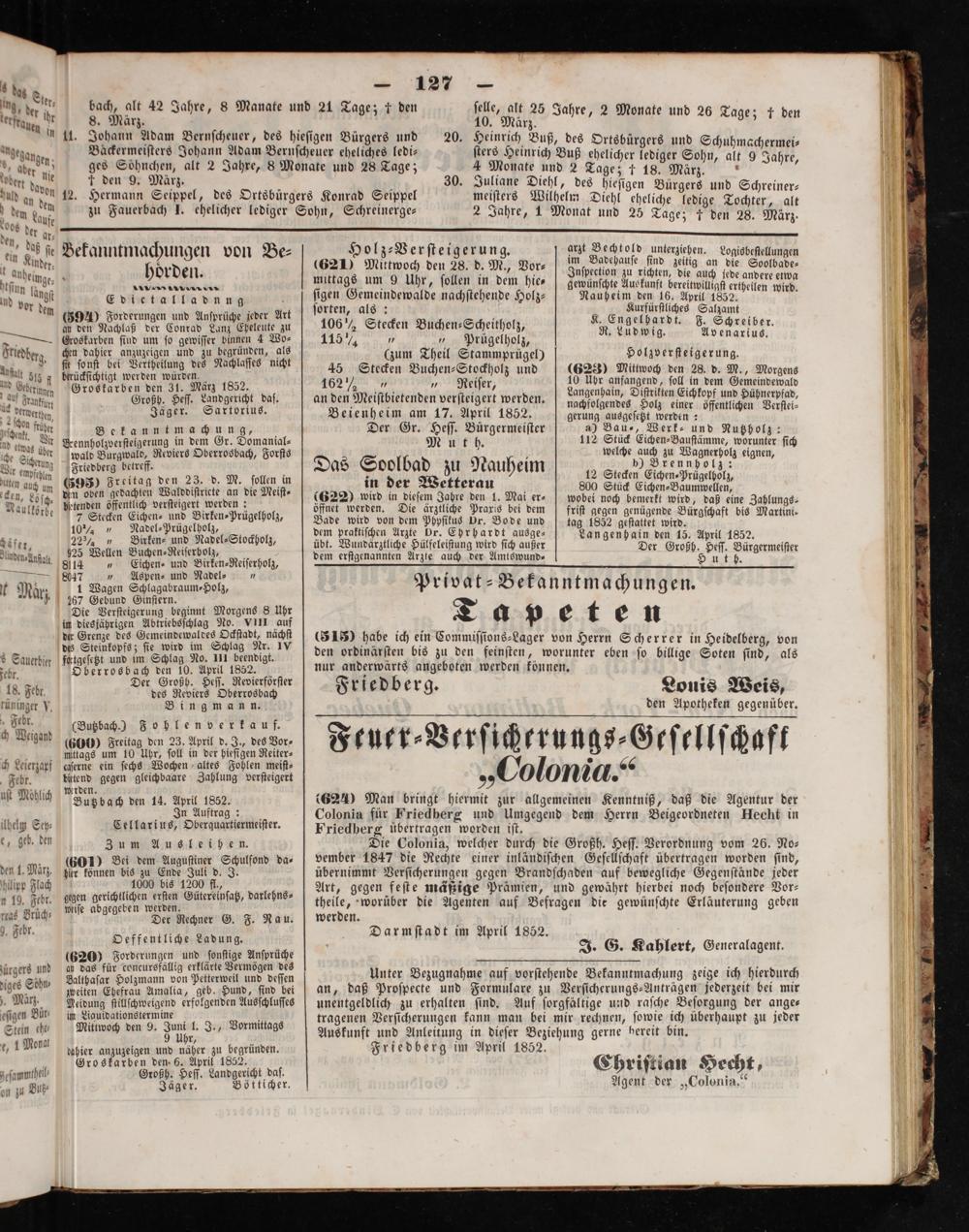 1624) Man bringt hiermit zur allgemeinen Kenntniß, daß die Agentur der Colonia für Friedberg und Umgegend dem Herrn Beigeordneten Hecht in Friedberg übertragen worden iſt.