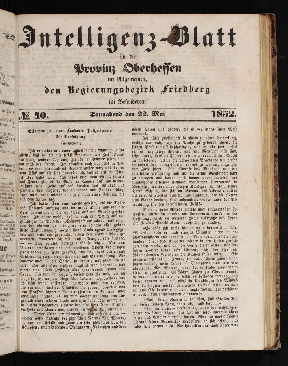 Ich erwachte mit einer ſtimmten Ahnung, nicht allein, daß ich die mir ſelbſt Wrgenommene Zeit geſchla— fen habe, ſondern daß auch Fremde im Zimmer ſeien, und um mich her ſtehen. Ich täͤuſchte mich übrigens in Bei— den; es war Niemand im Zimmer außer mir, und bei ei⸗ nem Blick auf die Uhr bemerkte ich, daß es erſt ein Vier⸗ tel über ſechs war. Ich erhob mich vom Stuhl, ſchürte das Feuer, ging etliche Male im Zimmer auf und nieder, lauſchte eine Weile auf das Heulen des Windes und Praſſeln des Regens, der an Laden und Fenſter ſchlug, ſetzte mich dann wieder und griff nach einer Zeitung, die auf dem Tiſche lag.