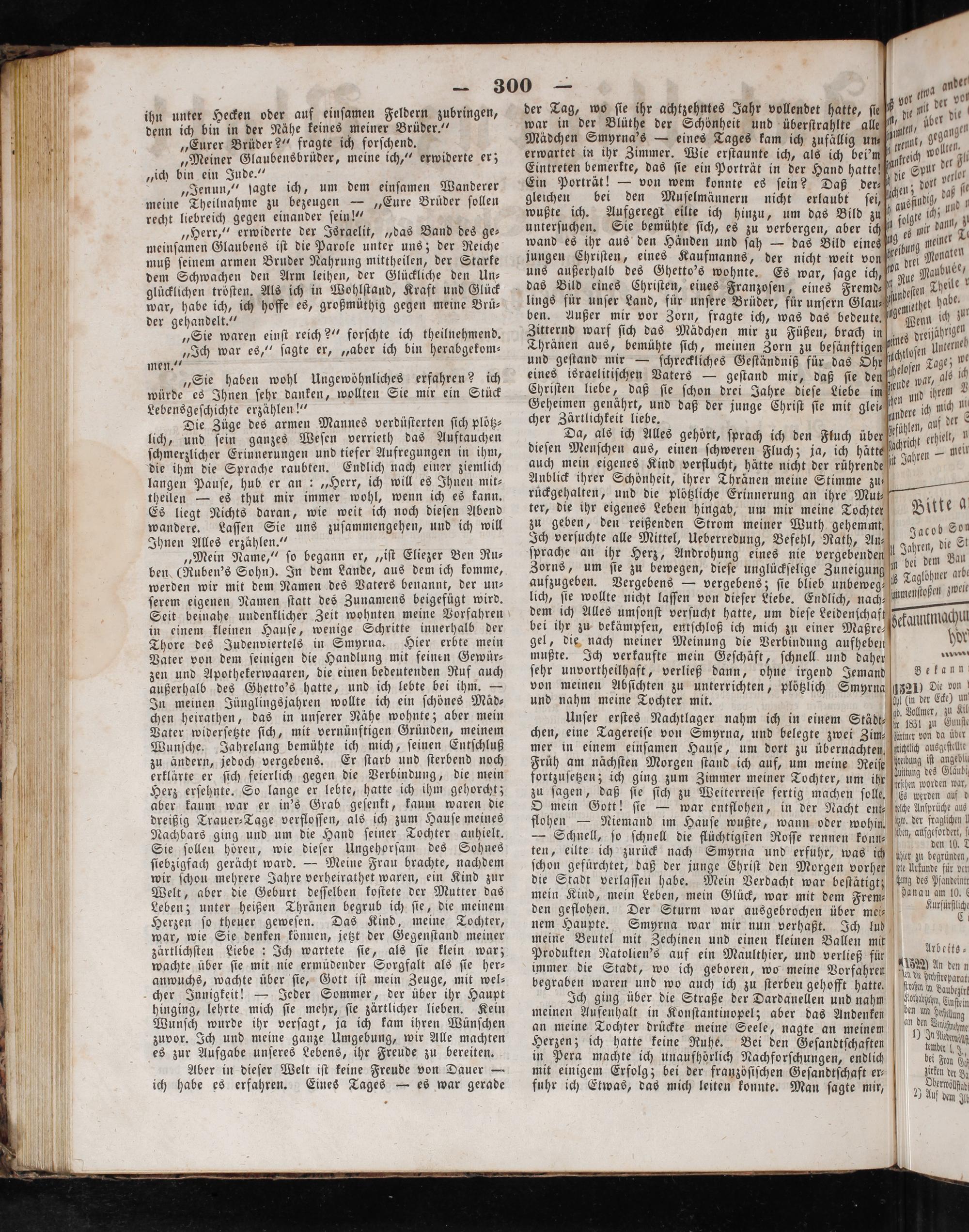 chen, eine Tagereiſe von Smyrna, und belegte zwei Zim— mer in einem einſamen Hauſe, um dort zu übernachten, Früh am nächſten Morgen ſtand ich auf, um meine Reiſe fortzuſetzen; ich ging zum Zimmer meiner Tochter, um ihr zu ſagen, daß ſie ſich zu Weiterreiſe fertig machen ſolle. O mein Gott! ſie— war entflohen, in der Nacht ent— flohen— Niemand im Hauſe wußte, wann oder wohin. — Schnell, ſo ſchnell die flüchtigſten Roſſe rennen konn— ten, eilte ich zurück nach Smyrna und erfuhr, was ich ſchon gefürchtet, daß der junge Chriſt den Morgen vorher die Stadt verlaſſen habe. Mein Verdacht war beſtatigtz mein Kind, mein Leben, mein Glück, war mit dem Frem⸗ den geflohen. Der Sturm war ausgebrochen über mei nem Haupte. Smyrna war mir nun verhaßt. Ich lud meine Beutel mit Zechinen und einen kleinen Ballen mit Produkten Natolien's auf ein Maulthier, und verließ für immer die Stadt, wo ich geboren, wo meine Vorfahren begraben waren und wo auch ich zu ſterben gehofft hatte.