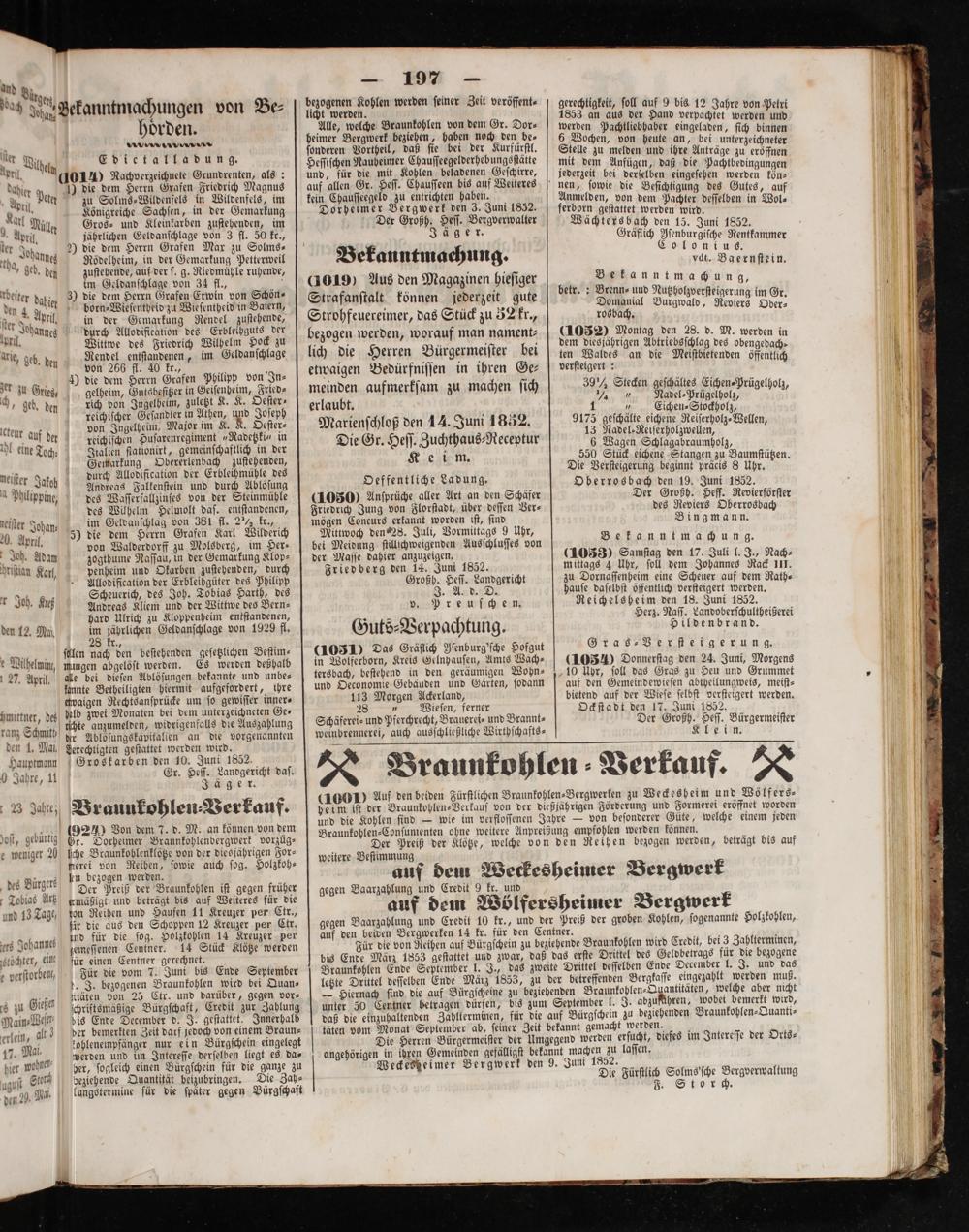 (1001) Auf den beiden Fürſtlichen Braunkohlen⸗Bergwerken zu Weckesheim und Wölfers⸗ heim iſt der Braunkohlen⸗Verkauf von der dießjährigen Förderung und Formerei eröffnet worden und die Kohlen ſind— wie im verfloſſenen Jahre— von beſonderer Güte, welche einem jeden Braunkohlen⸗Conſumenten ohne weitere Anpreißung empfohlen werden können.