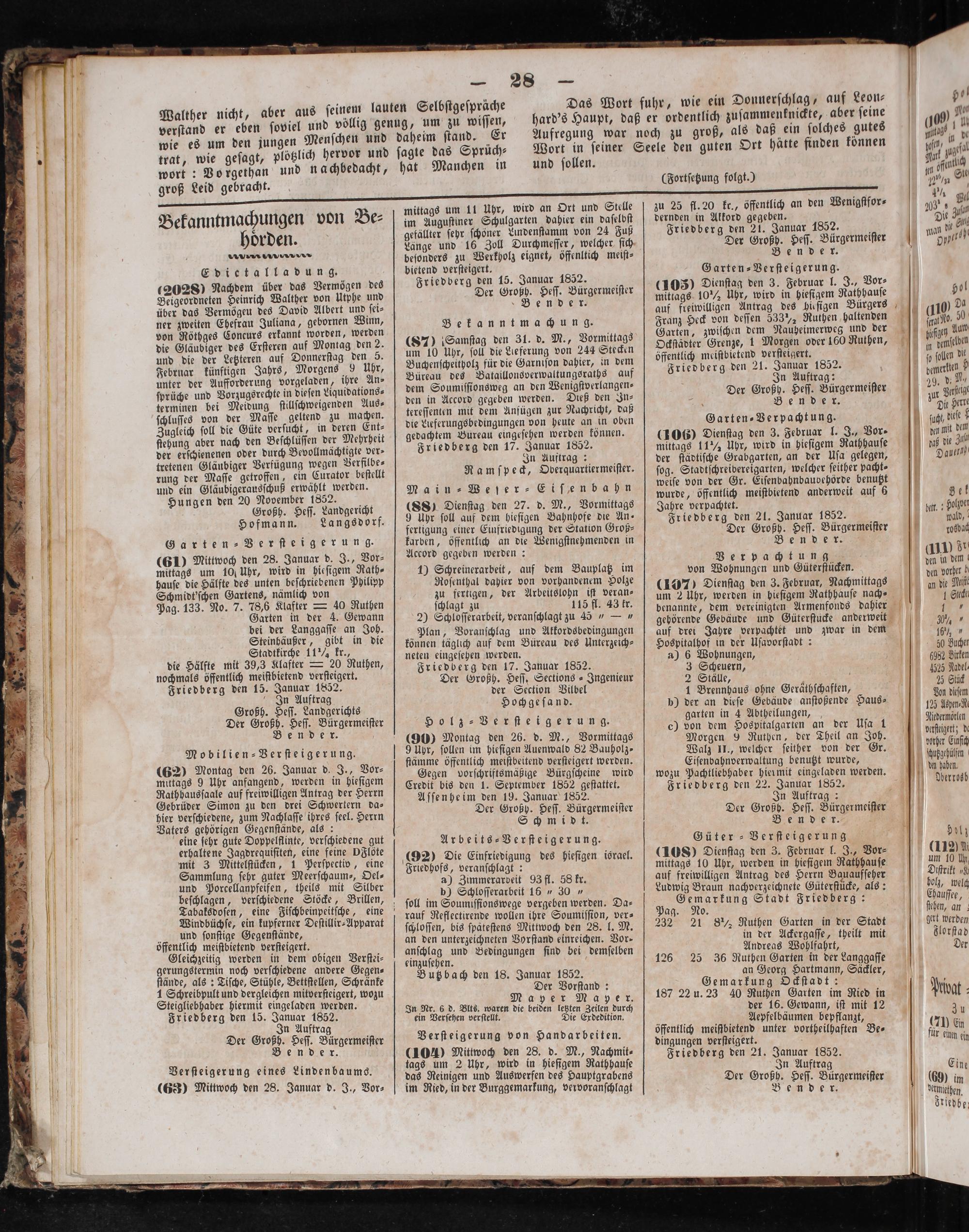 In Auftrag: 5 29. d. N. Der Großh. Heſſ. Bürgermeifßser 10 Saftige . Bender. Jud Here Garten⸗Verpachtung. 6 fab, dest! (406) Dienſtag den 3. Februar l. J., Vor. dun mit 14 mittags 11% Uhr, wird in hieſigem Rathhauſe 0 daß die 3 der ſtädtiſche Grabgarten, an der Uſa gelegen, Daun ſog. Stadtſchreibereigarten, welcher ſeither pacht⸗ weiſe von der Gr. Eiſenbahnbaubehörde benutzt 5 wurde, öffentlich meiſtbietend anderweit auf 6 Sek Jahre verpachtet. bl Holspet Friedberg den 21. Januar 1852. 5 pald Der Großh. Heſſ. Bürgermeiſter„ rosbac Bender. a1 Verpachtung den in dem von Wohnungen und Güterſtücken. den vorher, (107) Dienſtag den 3. Februar, Nachmittags z die Mu um 2 Uhr, werden in hieſigem Rathhauſe nach! 1 Geck benannte, dem vereinigten Armenfonds dahier gebörende Gebäude und Güterſtucke anderweit 30%. auf drei Jahre verpachtet und zwar in dem 10%„ Hospitalhof in der Uſavorſtadt: ö 50 Bucher eee 105 Sete 5 Scheuern, 525 Nudel 1, N 5 5 Sit 1 Brennhaus ohne Geräthſchaften, Jun deem p) der an dieſe Gebäude anſtoßende Haus⸗ 125 Ape garten in 4 Abtheilungen, Nidamörlen c) von dem Hospitalgarten an der Uſa 1 buſiihenz de Morgen 9 Ruthen, der Theil an Joh. wah Ef Walz II., welcher ſeither von der Gr. unrl Eiſenbahnverwaltung benutzt wurde, fate 10 11 wozu Pachtliebhaber hiermit eingeladen werden. 1 1 5 0 Friedberg den 22. Januar 1852. 1 ertos In Auftrag: 1 Der Großh. Heſſ. Bürgermeiſter e der 1 Güter ⸗Verſteigerung 4 Hol (108) Dienſtag den 3. Februar l. J., Vor⸗(1125 mittags 10 Uhr, werden in hiefigem Rathhauſe um 10 ln auf freiwilligen Antrag des Herrn Bauaufſeher Diffrikt„ Ludwig Braun nachverzeichnete Güterſtücke, als: bol, welg Gemarkung Stadt Friedberg: Chauſſee, Pag. No. ſtehen, an 232 21 8½ Ruthen Garten in der Stadt gert werden in der Ackergaſſe, theilt mit Florſtad Andreas Wohlfahrt, Der 126 25 36 Ruthen Garten in der Langgaſſe an Georg Hartmann, Säckler,. Gemarkung Ockſtadt: e 187 22 u. 23 40 Ruthen Garten im Ried in Nat a der 16. Gewann, iſt mit 12* 7 Aepfelbäumen bepflanzt, 70 U öffentlich meiftbietend unter vortheilhaften Be⸗ fl En dingungen verſteigert. 1 een kin Friedberg den 21. Januar 1852. In Auftrag Eine Der Großh. Heſſ. Bürgermeiſter(69) im Ben d e n Vermnethen. driedbe,