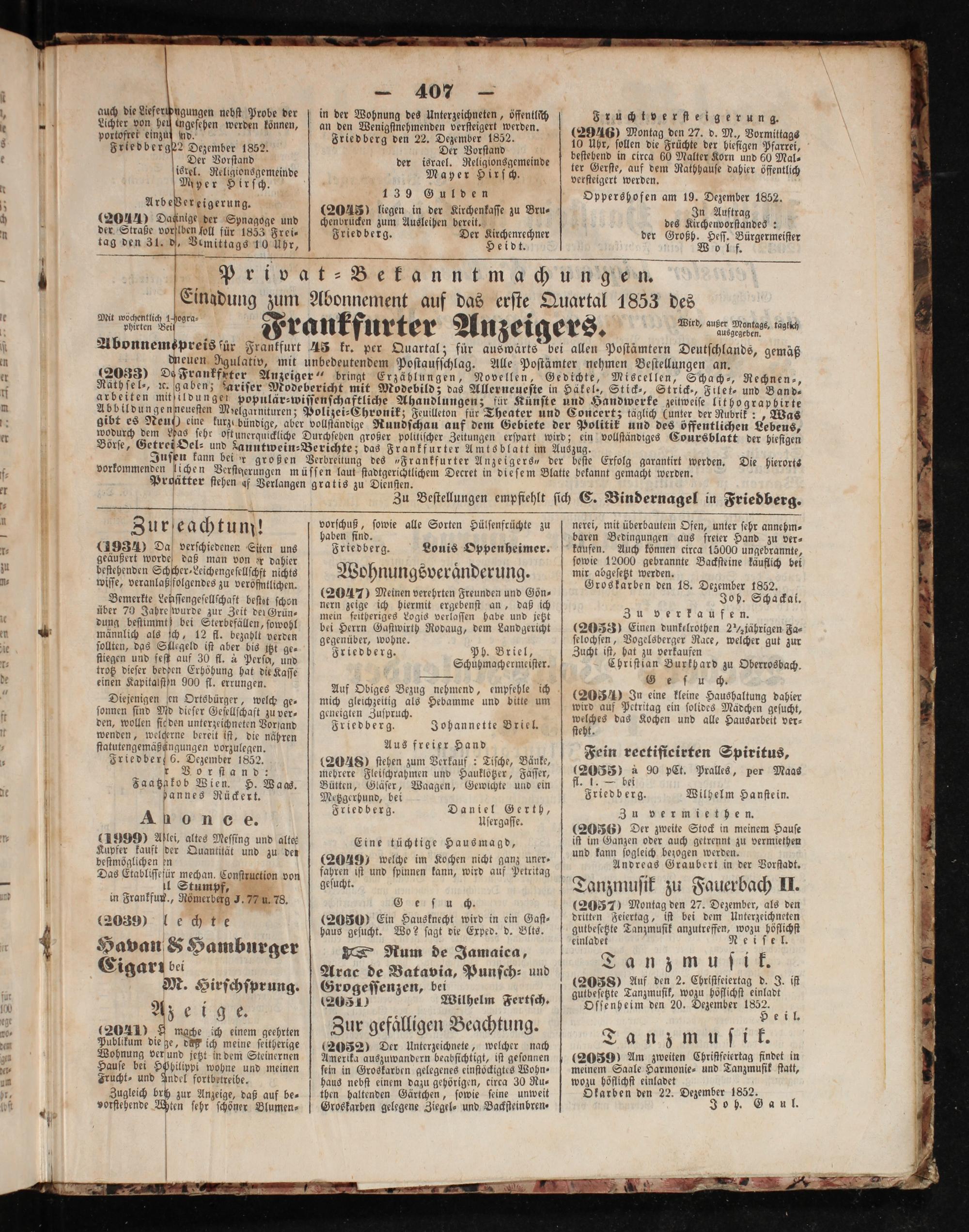 Tanzmuſik zu Fauerbach II. (2057) Montag den 27. Dezember, als den dritten Feiertag, iſt bei dem Unterzeichneten gutbeſetzte Tanzmuſik anzutreffen, wozu höflichſt einladet Nee ies Tanzmuſik. (2058) Auf den 2. Chriſtfeiertag d. J. iſt e Tanzmuſik, wozu höflichſt einladt Oſſenheim den 20. Dezember 15 4 e