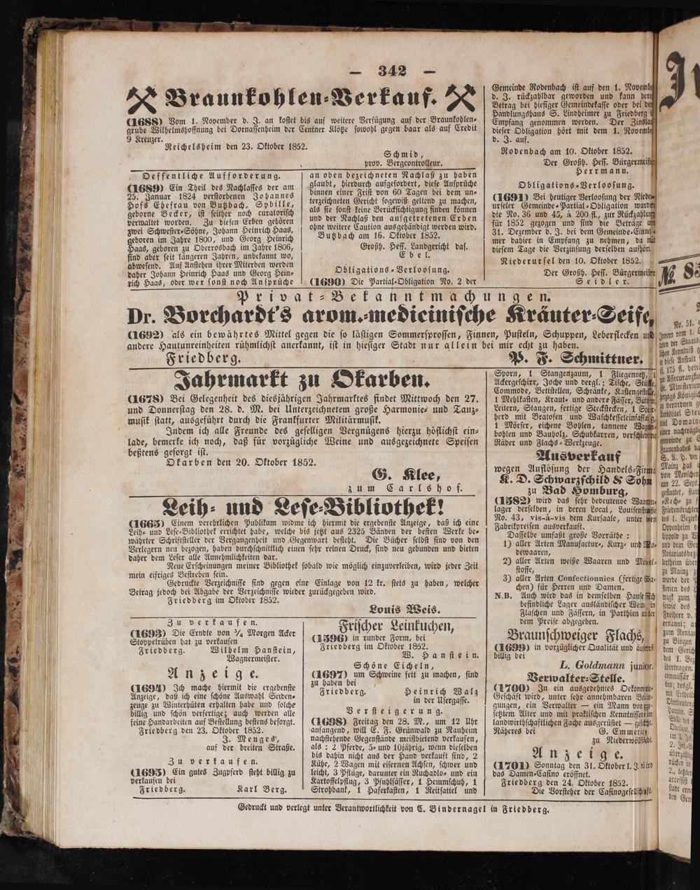 Friedberg den 23. Oktober 1852. J. Menges, auf der breiten Straße.