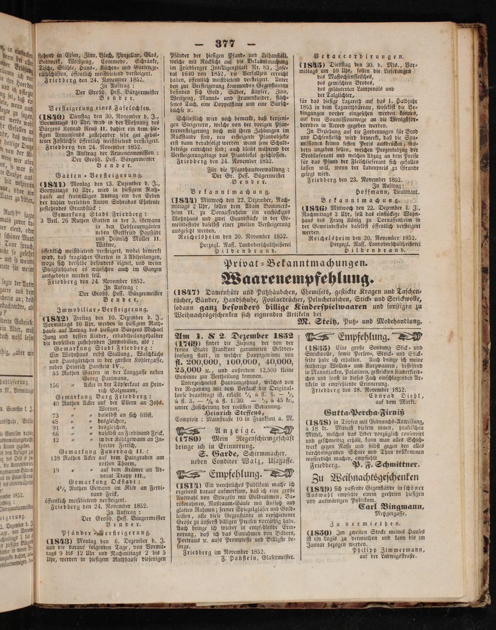 377 Pfänder der hieſigen Pfand⸗ und Leihanſtalt, welche mit Rücksicht auf die Bekanntmachung im Friedberger Intelligenzblatt Nr. 83, Inſe⸗ rat 1640 von 1852, die Verfallzeit erreicht haben, öffentlich meiſtbietend verſteigert. Unter