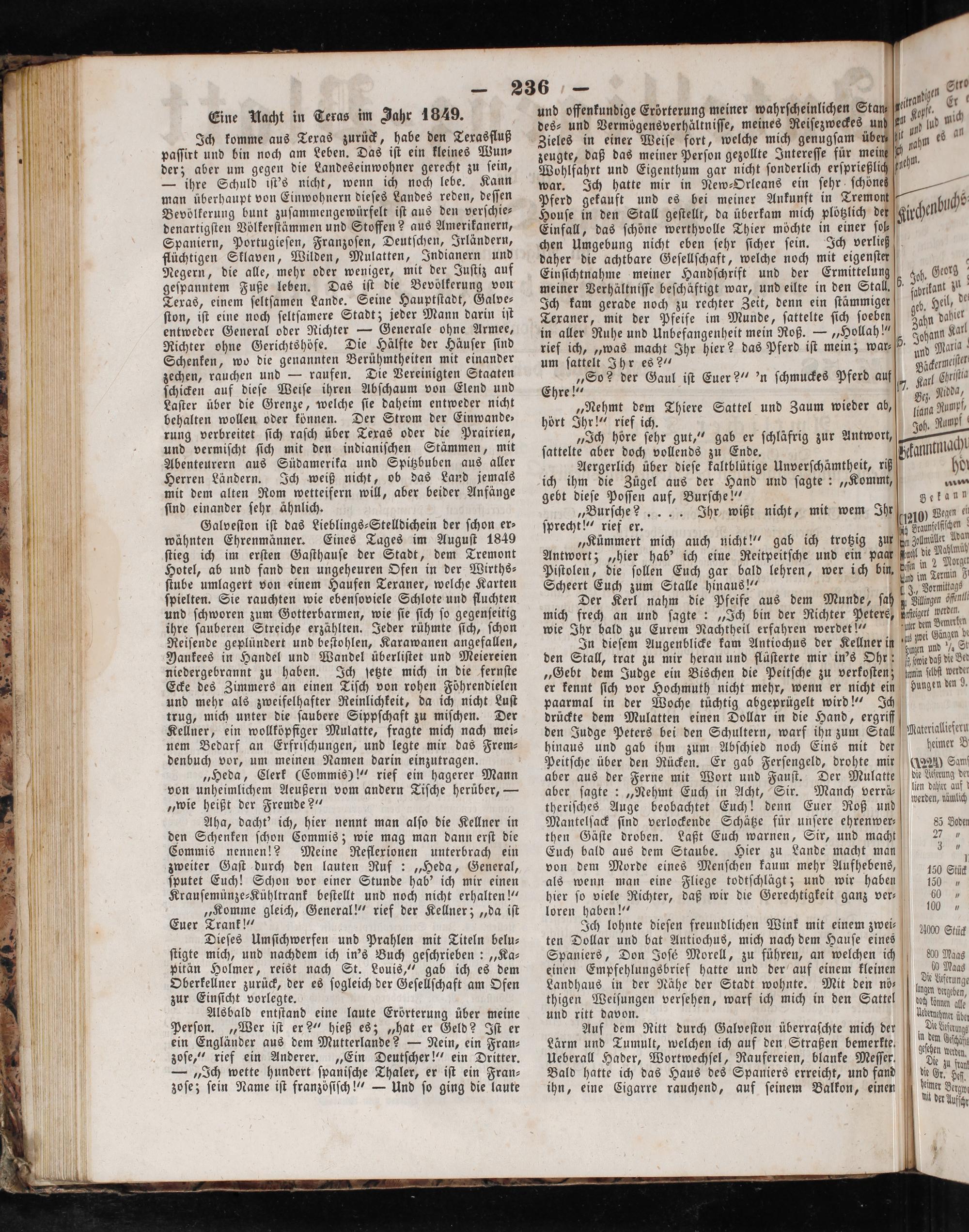 Ich komme aus Texas zurück, habe den Texas fluß paſſirt und bin noch am Leben. Das iſt ein kleines Wun⸗ der; aber um gegen die Landeseinwohner gerecht zu ſein, — ihre Schuld iſt's nicht, wenn ich noch lebe. Kann man überhaupt von Einwohnern dieſes Landes reden, deſſen Bevölkerung bunt zuſammengewürfelt iſt aus den verſchie⸗ denartigſten Völkerſtämmen und Stoffen? aus Amerikanern, Spaniern, Portugieſen, Franzoſen, Deutſchen, Irländern, flüchtigen Sklaven, Wilden, Mulatten, Indianern und Negern, die alle, mehr oder weniger, mit der Juſtiz auf geſpanntem Fuße leben. Das iſt die Bevölkerung von Texas, einem ſeltſamen Lande. Seine Hauptſtadt, Galve⸗ ſton, iſt eine noch ſeltſamere Stadt; jeder Mann darin iſt entweder General oder Richter— Generale ohne Armee, Richter ohne Gerichtshöfe. Die Hälfte der Häuſer ſind Schenken, wo die genannten Berühmtheiten mit einander zechen, rauchen und— raufen. Die Vereinigten Staaten ſchicken auf dieſe Weiſe ihren Abſchaum von Elend und Laſter über die Grenze, welche ſie daheim entweder nicht behalten wollen oder können. Der Strom der Einwande⸗ rung verbreitet ſich raſch uber Texas oder die Prairien, und vermiſcht ſich mit den indianiſchen Stämmen, mit Abenteurern aus Südamerika und Spitzbuben aus aller Herren Ländern. Ich weiß nicht, ob das Land jemals mit dem alten Rom wetteifern will, aber beider Anfänge ſind einander ſehr ähnlich.