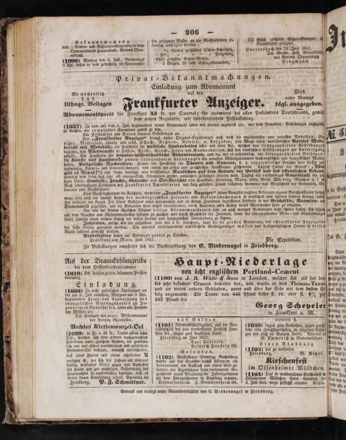 Juſeraten, welche wir die geſpaltene Zeile mit 4 kr. berechnen, kann bei der großen Verbreitung des„Frankfurter Anzeigers, Friedd der beſte Erfolg garantirt werden. Die hierorts vorkommenden amtlichen Verſteigerungen müſſen laut ſtadtgerichtlichem Decret in die ſenm Blatte bekannt gemacht werden. 0 N 5 Probeblätter ſtehen auf Verlangen gratis zu Dienſten.* das Gr. 4 Frankfurt am Main, Juni 1852. Die Expedition. Das Gr. Zu Beſtellungen empfiehlt ſich die Buchhandlung von E. Bindernagel in Friedberg. l f Schon Auf der Braunkohlengrube H a 1 f Trichet ö 9 2 bei dem Heſſenbrückenhammer a 1 v t 2 N 1 5 d 4* l 6 9 E Kapu (1010 ſind Kohlen zu den bekannten Preißen von ücht engliſchem Portland-Cement ungen, de vorräthig.(1100) von J. R. Mhite& Sons in London, welcher ſich als der beſtt frühe zu u