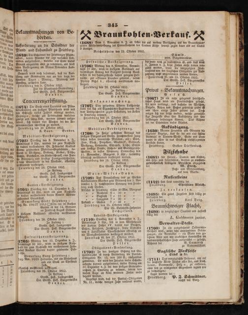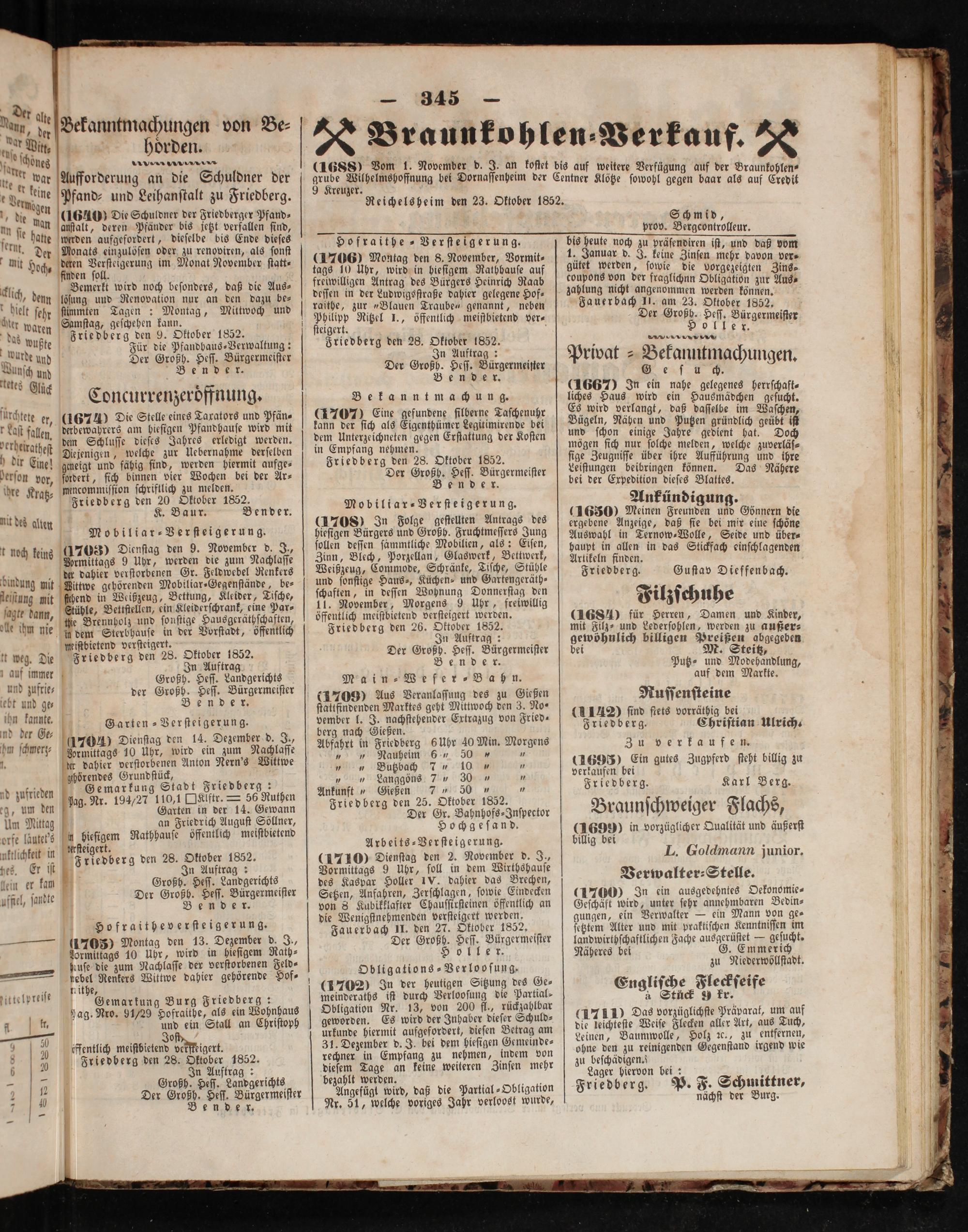 (1707) Eine gefundene ſilberne Taſchenuhr kann der ſich als Eigenthümer Legitimirende bei dem Unterzeichneten gegen Erſtattung der Koſten in Empfang nehmen. Friedberg den 28. Oktober 1852. Der Großh. Heſſ. Bürgermeiſter Bender.