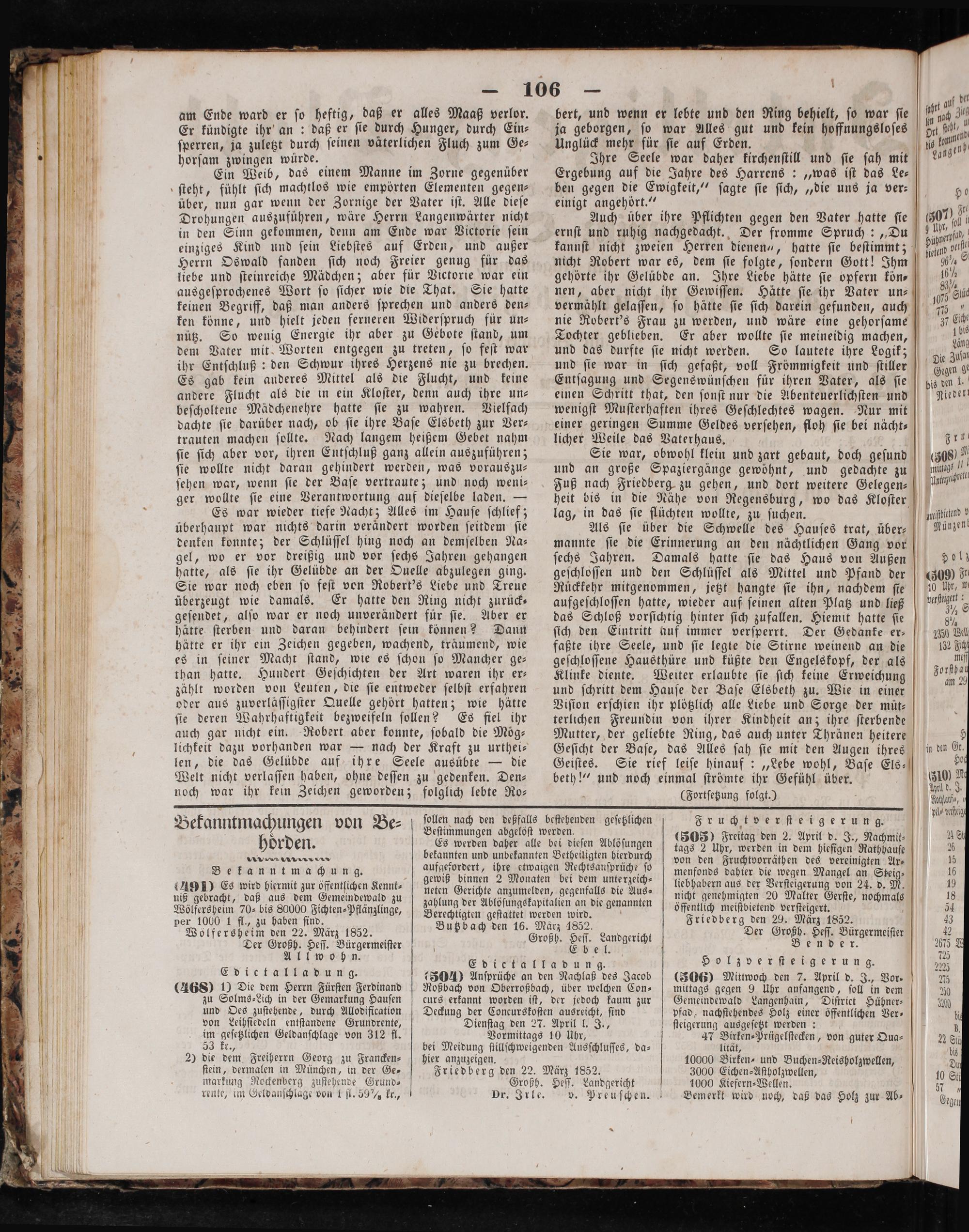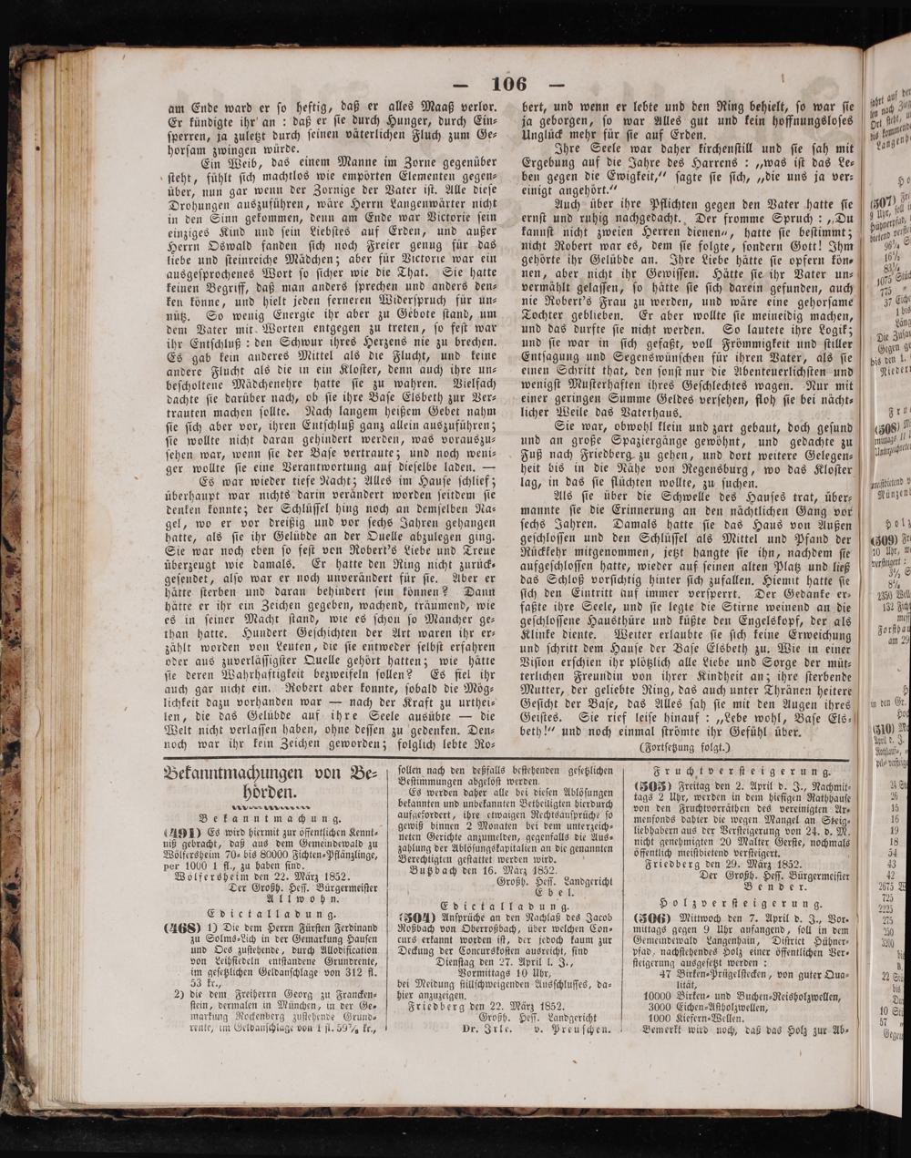 über, nun gar wenn der Zornige der Vater iſt. Alle dieſe Drohungen auszuführen, wäre Herrn Langenwärter nicht in den Sinn gekommen, denn am Ende war Victorie ſein einziges Kind und ſein Liebſtes auf Erden, und außer Herrn Oswald fanden ſich noch Freier genug für das liebe und ſteinreiche Madchen; aber für Victorie war ein ausgeſprochenes Wort ſo ſicher wie die That. Sie hatte keinen Begriff, daß man anders ſprechen und anders den⸗ ken könne, und hielt jeden ferneren Widerſpruch für un⸗ nütz. So wenig Energie ihr aber zu Gebote ſtand, um dem Vater mit Worten entgegen zu treten, ſo feſt war ihr Entſchluß: den Schwur ihres Herzens nie zu brechen. Es gab kein anderes Mittel als die Flucht, und keine andere Flucht als die in ein Kloſter, denn auch ihre un— beſcholtene Mädchenehre hatte ſie zu wahren. Vielfach dachte ſie darüber nach, ob ſie ihre Baſe Elsbeth zur Ver⸗ trauten machen ſollte. Nach langem heißem Gebet nahm ſie ſich aber vor, ihren Entſchluß ganz allein auszuführen; ſie wollte nicht daran gehindert werden, was vorauszu— ſehen war, wenn ſie der Baſe vertraute; und noch weni- ger wollte ſie eine Verantwortung auf dieſelbe laden.—