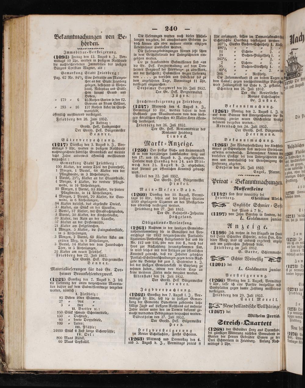 warthfeld, öffentlich meiſtbietend verſteigert. Friedberg den 28. Juni 1852. In Auftrag: Großh. Heſſ. Landgerichts Der Großh. Heſſ. Bürgermeiſter Bend e r.