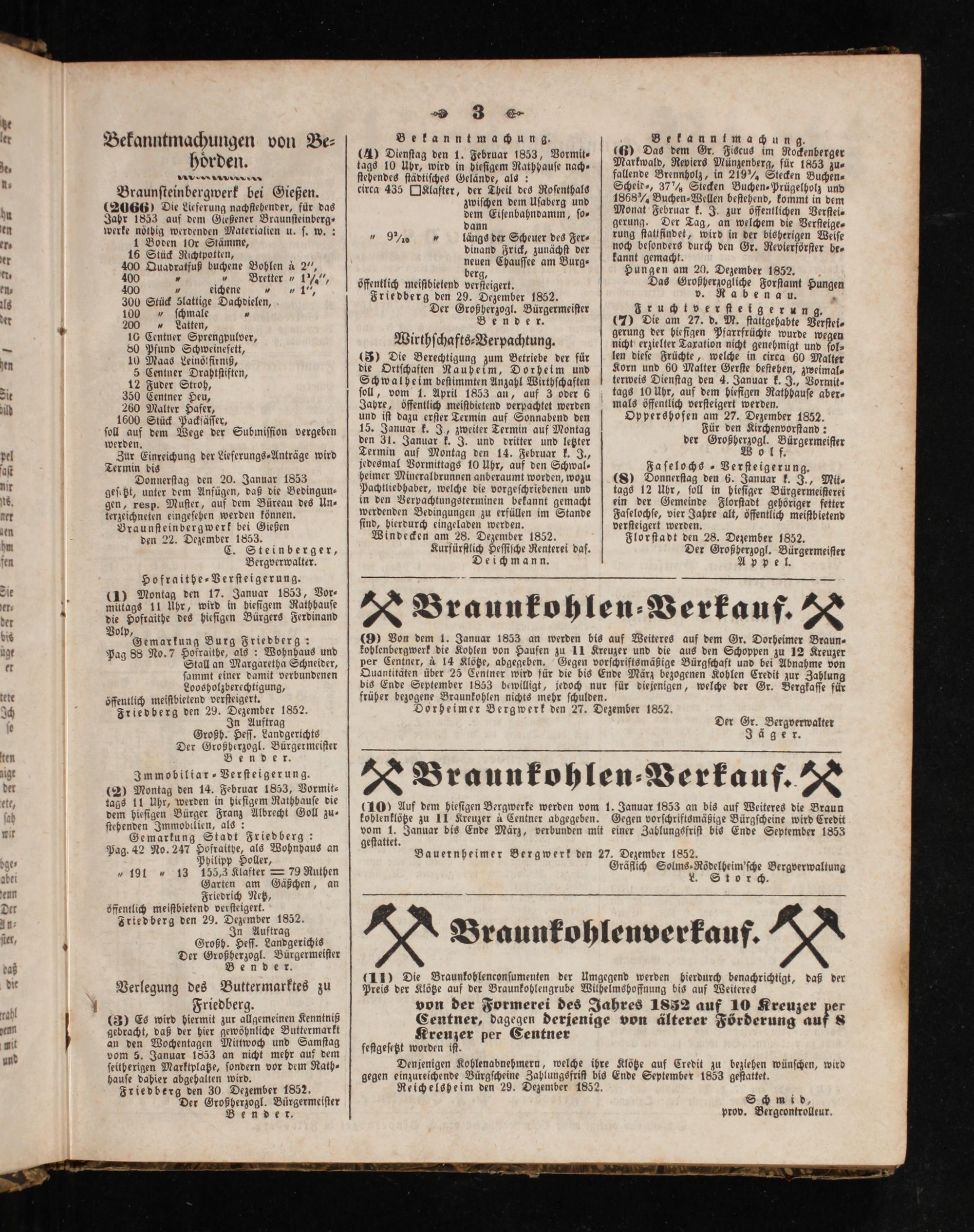(10) Auf dem hieſigen Bergwerke werden vom 1. Januar 1853 an bis auf Weiteres die Braun kohlenklötze zu 11 Kreuzer à Centner abgegeben. Gegen vorſchriftsmäßige Bürgſcheine wird Credit vom 1. Januar bis Ende März, verbunden mit einer Zablungsfriſt bis Ende September 1853 geſtattet.