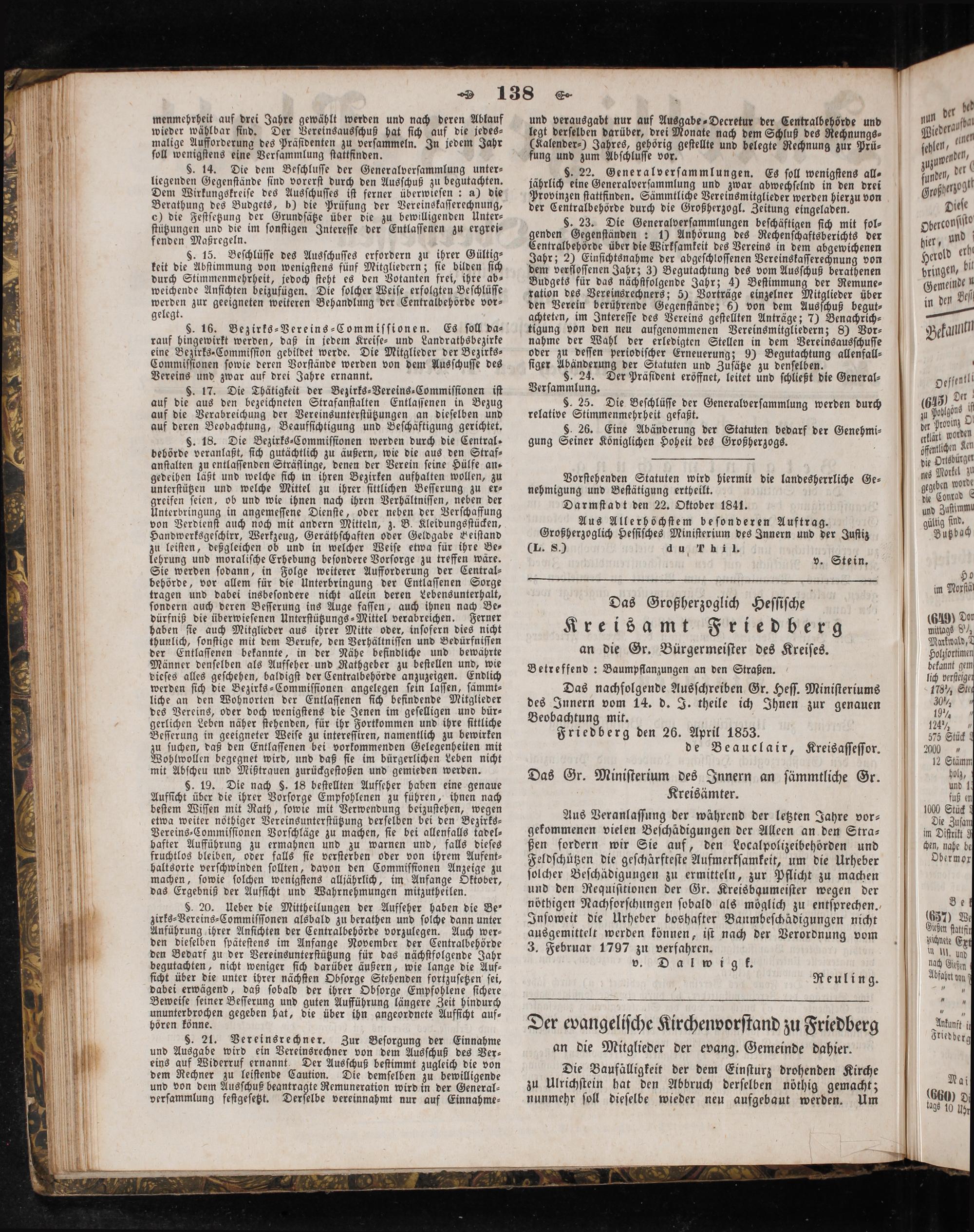 Vorſtehenden Statuten wird hiermit die landesherrliche Ge⸗ nehmigung und Beſtätigung ertheilt. Darmſtadt den 22. Oktober 1841. Aus Allerhöchſtem beſonderen Auftrag. Großherzoglich Heſſiſches Miniſterium des Innern und der Juſtiz (L. S.) du Thi!. v. Stein.