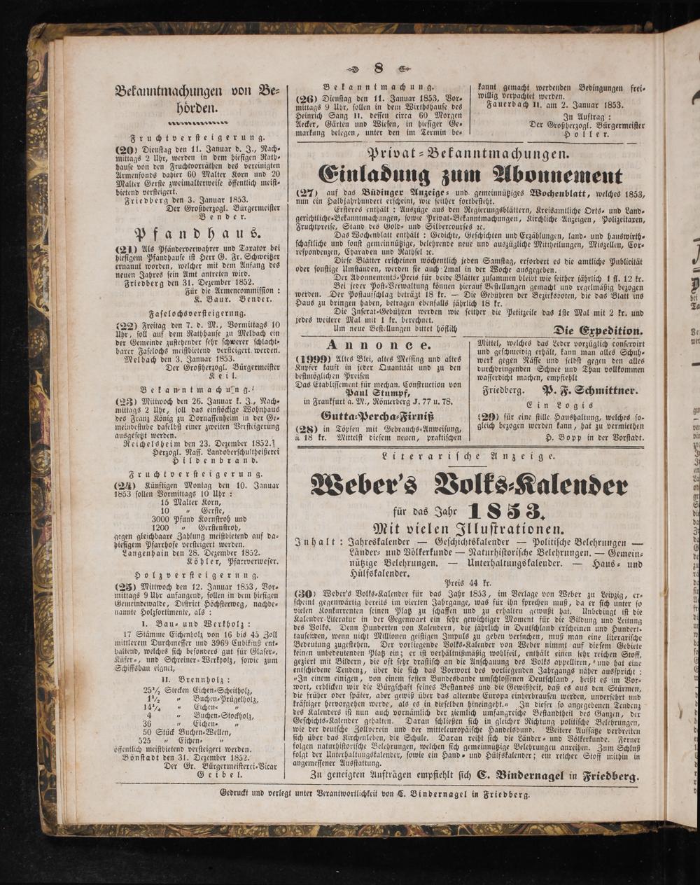 Gedruckt und verlegt unter Verantwortlichkeit von C. Bindernagel in Friedberg.