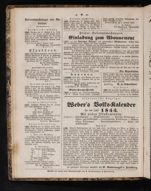 (27) auf das Büdinger Anzeige⸗ und gemeinnütziges Wochenblatt, welches 1853, nun ein Halbjahrhundert erſcheint, wie ſeither fortbeſteht.