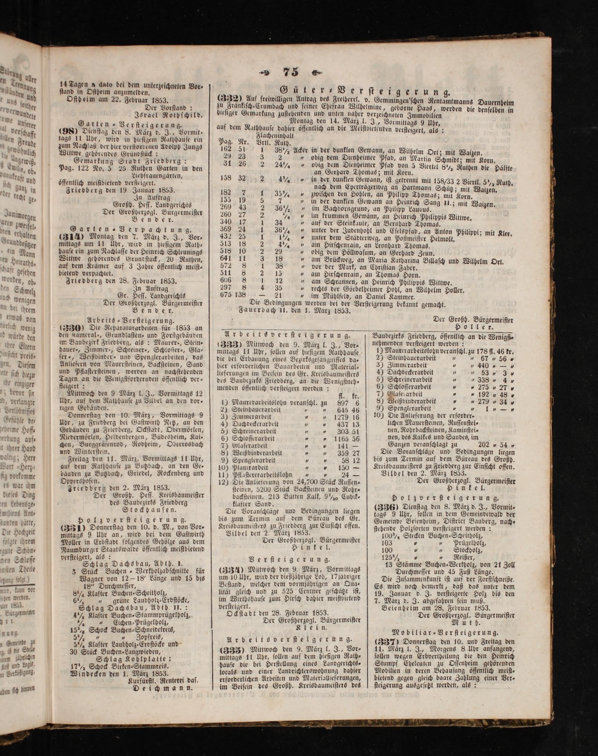 ternng a0— 73 E er 1 Teng 14 Tagen a dato bei dem unkerzeichneten Vo 5. anden 1 10 in Oſtheim anzumelden. deich 90 G G 1 5 575 et teh 9. 1 N ſtheim am 22. Februar 1853. 332) Auf freiwilligen Antrag des Freiherrl. v. Gemmingen'ſchen Rentamt f* either Der Vorſtand: 0 tan en e ſeiner Ehefrau Wilhelmine, 1„ werben die 77 Wunde Jsrael Rothſchild. eſiger Gemarkung zuſtehenden und unten näher verzeichneten Immobilien Mer Garten Verſteigerun 5. auf dem R Montag den 14. Marz l. J., Wim 9 Uhr, erſchafft(98) Dienſtag den 8. März d. J., Vormit⸗ 90 ache e öffentlich an die Meiſtbietenden verfteigert, als: Freude tags 9 wird in hieſigem Rathhauſe ein Pag. Nr. Vrtl 0 Ar zum Nachlaß der hier verſtorbenen Adolph Jungs 3 g e; 5 0 N wohnlich Wittwe gebörendes Grundſſück: 9 8 7 1 35% Acker in der dunklen Gewann, an Wilhelm Ort; mit Waizen. 1 g 8 Ac, 2 3 2„ obig dem Dienheimer Pfad, an Martin Schmidt: mi zAgewiß⸗ Gemarkung Stadt Friedberg 31 26 2 24“ big er Par zetin Schmidt; mit Korn. Lulle, ob Pag. 122 No. 5 25 Ruthen Garten in den e ad Gerste Thoma 912* Viertel 8½ Ruthen die Hälfte a Uiebfrauengärten, 1 N 5 1 2 1 n! * und oͤffentlich meiſtbietend verſteigert. des 8 2 n e e eee it getrennt mit 158/33 2 Viertl. 5 Ruth. „ Janz in Friedberg den 19 Jauuar 1853. E zwichen den Höhlen, al pic Tpemae en Waizen. kecht ge In Auftrag 155 5 N f 7*. mas; mit Korn. dee 8 e eden„Nin der dunklen Gewann an Heinrich Sang II.; mi b 0 u e ee 0 0 2 30%„ im Bachborngrund, an Philipp Laus. t Watzen. Aunimorgen Fenner e 260 27 2%„ im krummen Gewänn, an Heinrich Philippis Wittwe. tren zweifel 8 f 8 Ve 4 5 349 1 1 15„auf der Steinkaule, an Bernhard Thomas. Pe arten ⸗ er pa ung. 2 6¼ JNunter der Judenhohl und Eſelspfad, an Anton Philippi; mi alten ae— 185 7. März d. J., Vor⸗ 505 5 0 1%„unter dem Städterweg, an Poſtmeiſter welt e mittags um r, wird in hieſigem Rath⸗ 513 1 4%„ am Hirſchenrain, an Leonhard Thomas. hauſe ein zum Nachlaſſe der Heinrich Schleunings 318, 0 2 20 W obig dem Höllwaſum, an dHerhac Zeun. Wiuwe gehörendes Grundſtuck, 20 Ruthen,, 641 1 3 18„ am Brückweg, an Maria Katharina Billaſch und Wilhelm Ort. auf dem Krämer auf 3 Jahre öffentlich meiſt⸗ ,,„vor der Mark, an Chriſtian Faber. bietend verpachtet. 2 8 511 8 2 15„ am Hirſchenrain, an Thomas Horn. özriedberg den 28. Februar 1853. 5 D dene dene„am Schrannen, an Heinrich Philippis Wittwe. In Auftrag rn eee rechts der Görbelheimer Hohl, an Wilhelm Holler. Gr. Heſſ. Landgerichts 675 138— 21„ im Mühlfeld, an Daniel Kammer.