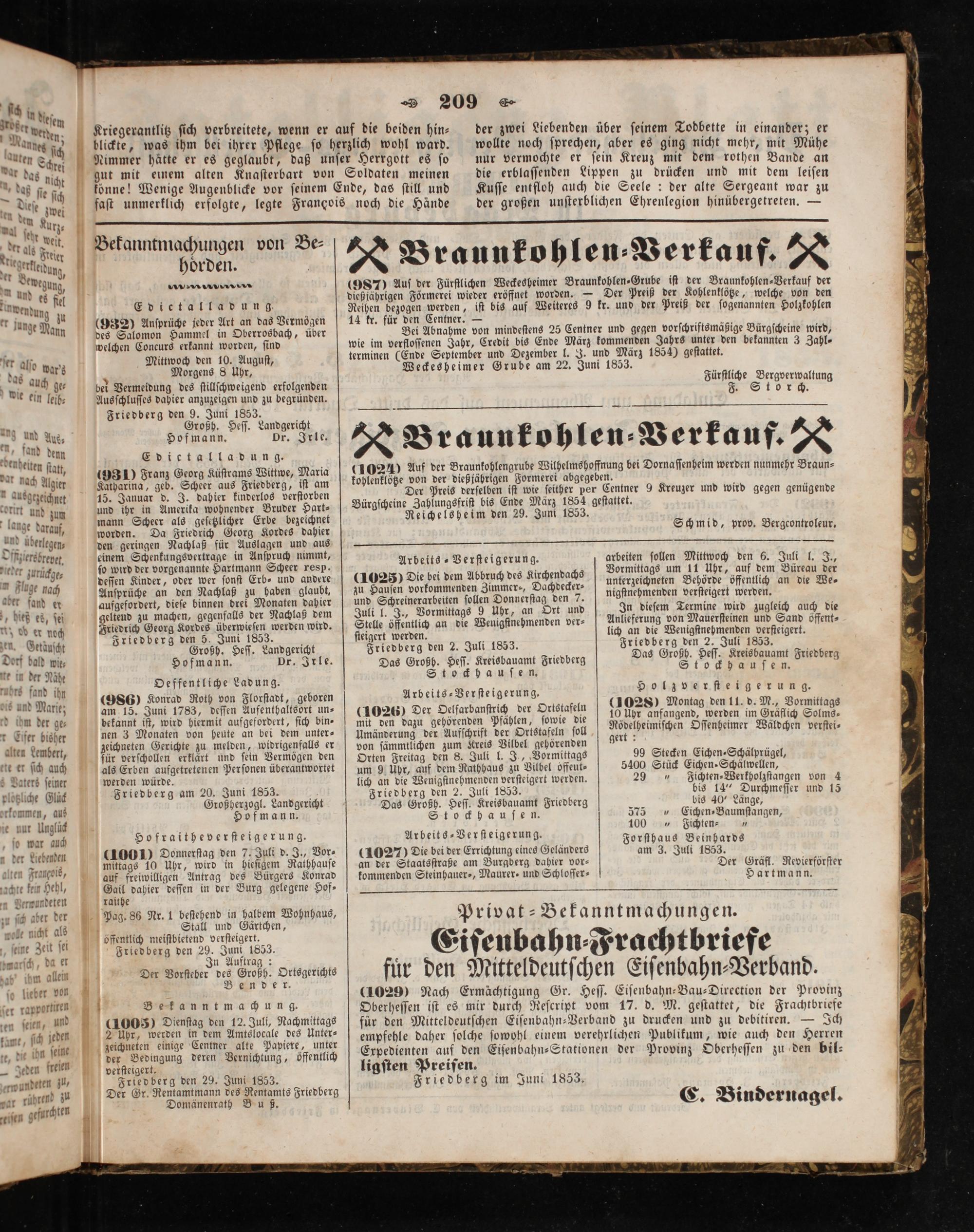 (1029) Nach Ermächtigung Gr. Heſſ. Eiſenbahn-Bau-Direction der Provinz Oberheſſen iſt es mir durch Reſcript vom 17. d. M. geſtattet, die Frachtbriefe für den Mitteldeutſchen Eiſenbahn-Verband zu drucken und zu debitiren.— Ich empfehle daher ſolche ſowohl einem verehrlichen Publikum, wie auch den Herren Expedienten auf den Eiſenbahn-Stationen der Provinz Oberheſſen zu den bil— ligſten Preiſen.