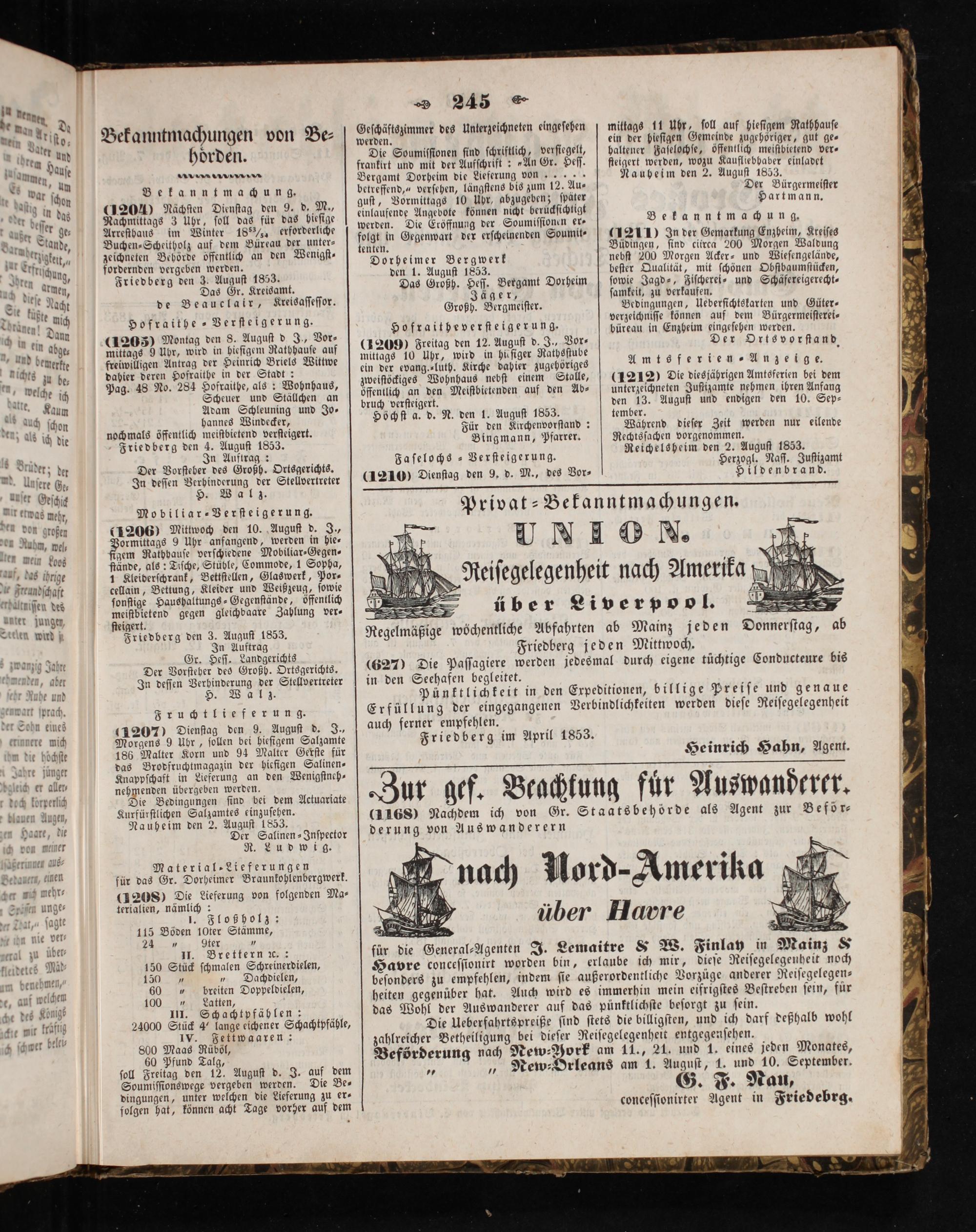 Regelmäßige wöchentliche Abfahrten ab Mainz jeden Donnerſtag, ab Friedberg jeden Mittwoch. (627) Die Paſſagiere werden jedesmal durch eigene tüchtige Conducteure bis