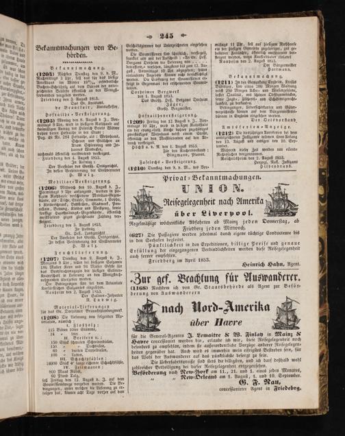 Die Ueberfahrtspreiße ſind ſtets die billigſten, und ich darf deßhalb wohl zahlreicher Betheiligung bei dieſer Reiſegelegenheit entgegenſehen. Beförderung nach New⸗York am 11., 21. und 1. eines jeden Monates,