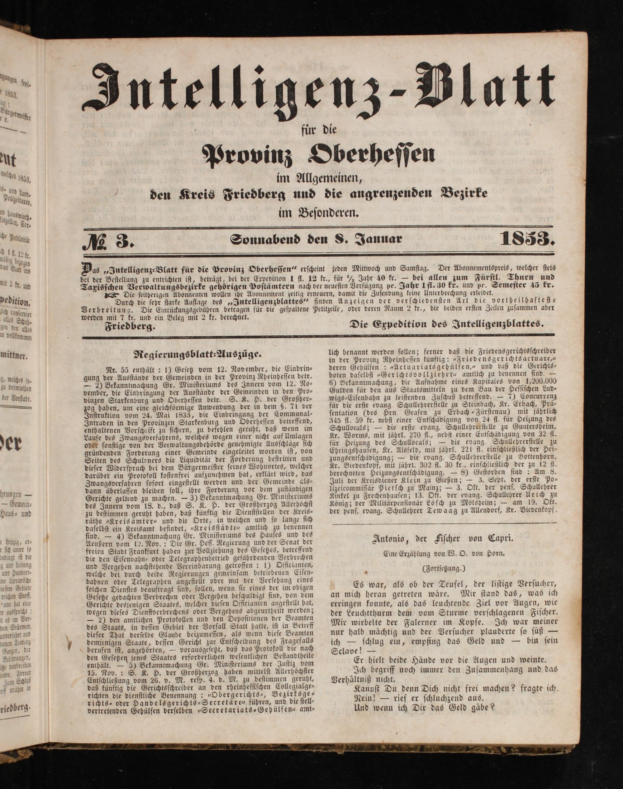 Das„Intelligenz⸗Blatt für die Provinz Oberheſſen“ erſcheint jeden Mittwoch und Samſtag. Der Abonnementspreis, welcher ſtets bei der Beſtellung zu entrichten iſt, beträgt, bei der Expedition 1 fl. 12 kr., für /½ Jahr 40 kr.— bei allen zum Fürſtl. Thurn und Taxisſchen Verwaltungsbezirke gehörigen Poſtämtern nach der neueſten Verfügung pr. Jahr 1 fl. 30 kr. und pr. Semeſter 45 kr. Die ſeitherigen Abonnenten wollen ihr Abonnement zeitig erneuern, damit die Zuſendung keine Unterbrechung erleidet. Durch die ſehr ſtarke Auflage des„Intelligenzblattes“ finden Anzeigen der verſchiedenſten Art die vortheilhafteſte Verbreitung. Die Einrückungsgebühren betragen für die geſpaltene Petitzeile, oder deren Raum 2 kr., die beiden erſten Zeilen zuſammen aber
