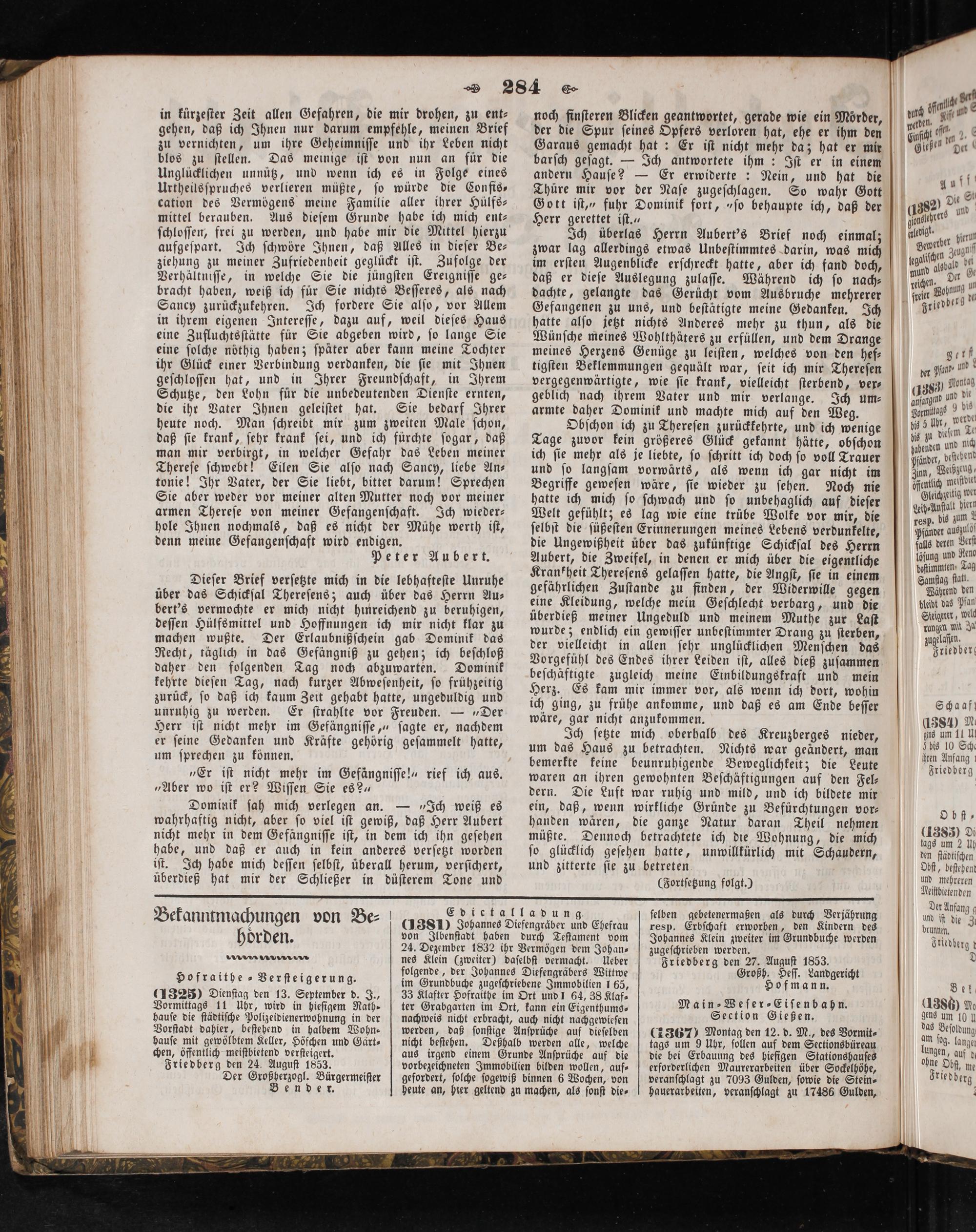in kürzeſter Zeit allen Gefahren, die mir drohen, zu ent⸗ gehen, daß ich Ihnen nur darum empfehle, meinen Brief zu vernichten, um ihre Geheimniſſe und ihr Leben nicht blos zu ſtellen. Das meinige iſt von nun an für die Unglücklichen unnütz, und wenn ich es in Folge eines Urtheilsſpruches verlieren müßte, ſo würde die Confis⸗ cation des Vermögens meine Familie aller ihrer Hülfs⸗ mittel berauben. Aus dieſem Grunde habe ich mich ent— ſchloſſen, frei zu werden, und habe mir die Mittel hierzu aufgeſpart. Ich ſchwöre Ihnen, daß Alles in dieſer Be⸗ ziehung zu meiner Zufriedenheit geglückt iſt. Zufolge der Verhältuiſſe, in welche Sie die jüngſten Ereigniſſe ge— bracht haben, weiß ich für Sie nichts Beſſeres, als nach Sancy zurückzukehren. Ich fordere Sie alſo, vor Allem in ihrem eigenen Intereſſe, dazu auf, weil dieſes Haus eine Zufluchtsſtätte für Sie abgeben wird, ſo lange Sie eine ſolche nöthig haben; ſpäter aber kann meine Tochter ihr Glück einer Verbindung verdanken, die ſie mit Ihnen geſchloſſen hat, und in Ihrer Freundſchaft, in Ihrem Schutze, den Lohn für die unbedeutenden Dienſte ernten, die ihr Vater Ihnen geleiſtet hat. Sie bedarf Ihrer heute noch. Man ſchreibt mir zum zweiten Male ſchon, daß ſie krank, ſehr krank ſei, und ich fürchte ſogar, daß man mir verbirgt, in welcher Gefahr das Leben meiner Thereſe ſchwebt! Eilen Sie alſo nach Sancy, liebe An— tonie! Ihr Vater, der Sie liebt, bittet darum! Sprechen Sie aber weder vor meiner alten Mutter noch vor meiner armen Thereſe von meiner Gefangenſchaft. Ich wieder⸗ hole Ihnen nochmals, daß es nicht der Mühe werth iſt, denn meine Gefangenſchaft wird endigen. Peter Aubert.