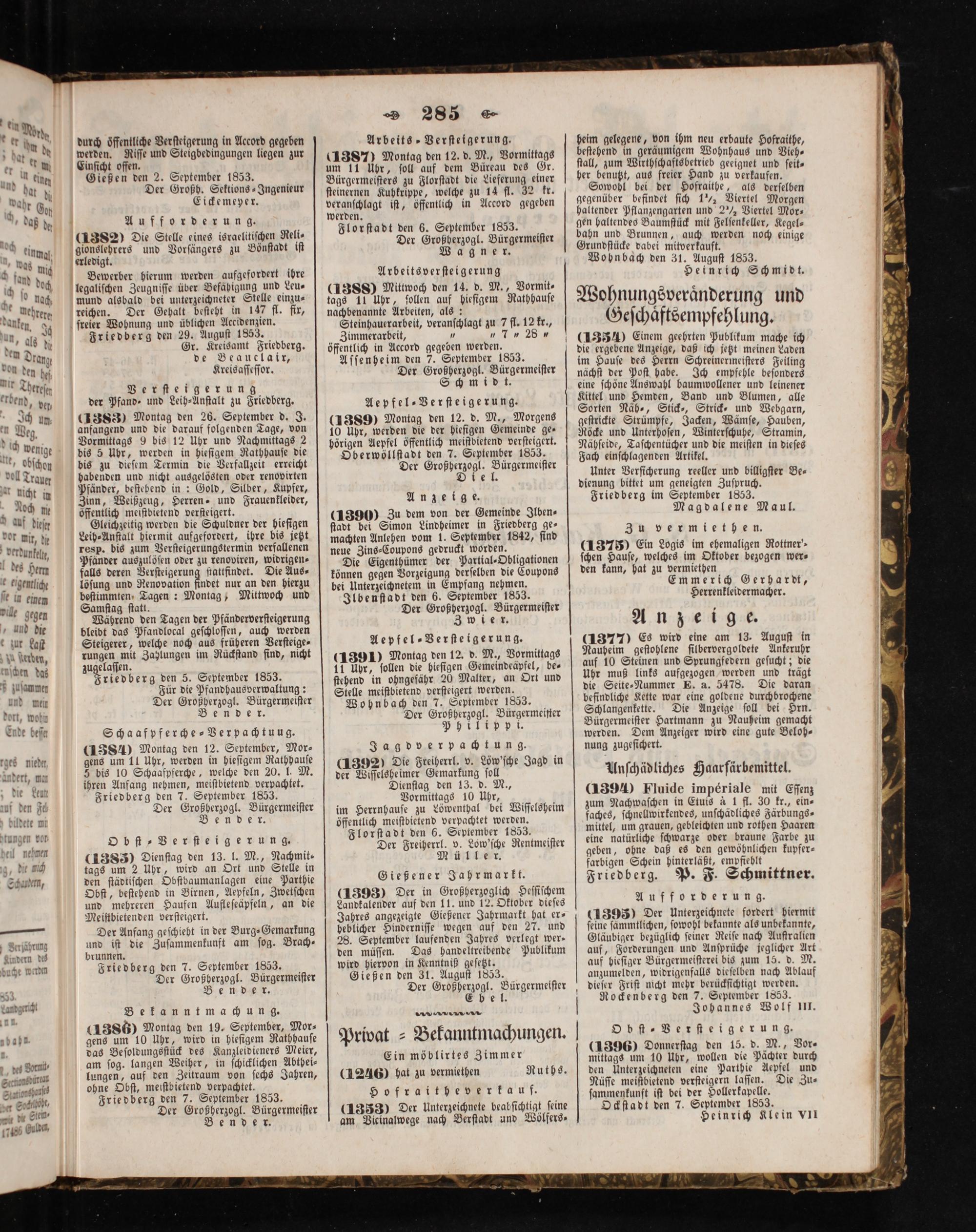 Friedberg den 7. September 1853. Der Großherzogl. Bürgermeiſter 5( e e