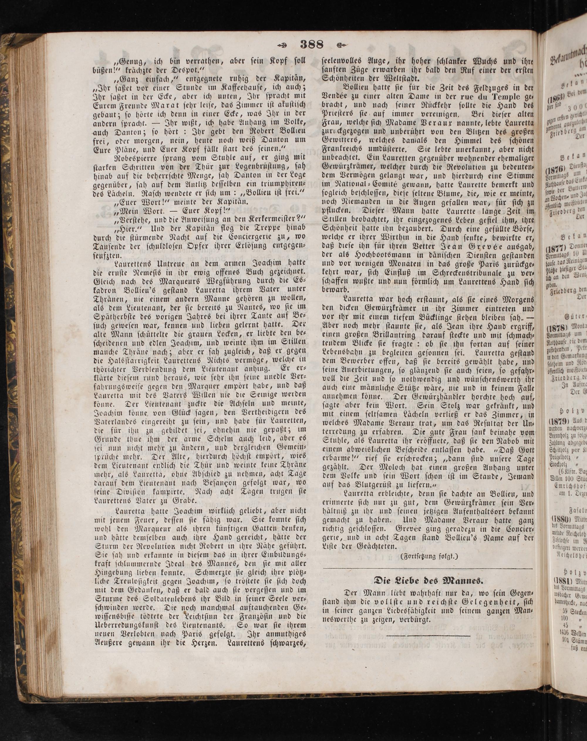 Lauretta hatte Joachim wirklich geliebt, aber nicht mit jenem Feuer, deſſen ſie fähig war. Sie konnte ſich wohl den Marqueur als ihren künftigen Gatten denken, und hätte demſelben auch ihre Hand gereicht, hätte der Sturm der Revolution nicht Robert in ihre Nähe geführt. Sie ſah und erkannte in dieſem das in ihrer Einbildungs— kraft ſchlummernde Ideal des Mannes, den ſie mit aller Hingebung lieben konnte. Schmerzte ſie gleich ihre ploͤtz— liche Treuloſigkeit gegen Joachim, ſo tröſtete ſie ſich doch mit dem Gedanken, daß er bald auch ſie vergeſſen und im Sturme des Soldatenlebens ihr Bild in ſeiner Seele ver— ſchwinden werde. Die noch manchmal auftauchenden Ge— wiſſensbiſſe tödtete der Leichtſinn der Franzöſin und die Ueberredungskunſt des Lieutenants. So war ſie ihrem neuen Verlobten nach Paris gefolgt. Ihr anmuthiges Aeußere gewann ihr die Herzen. Laurettens ſchwarzes,