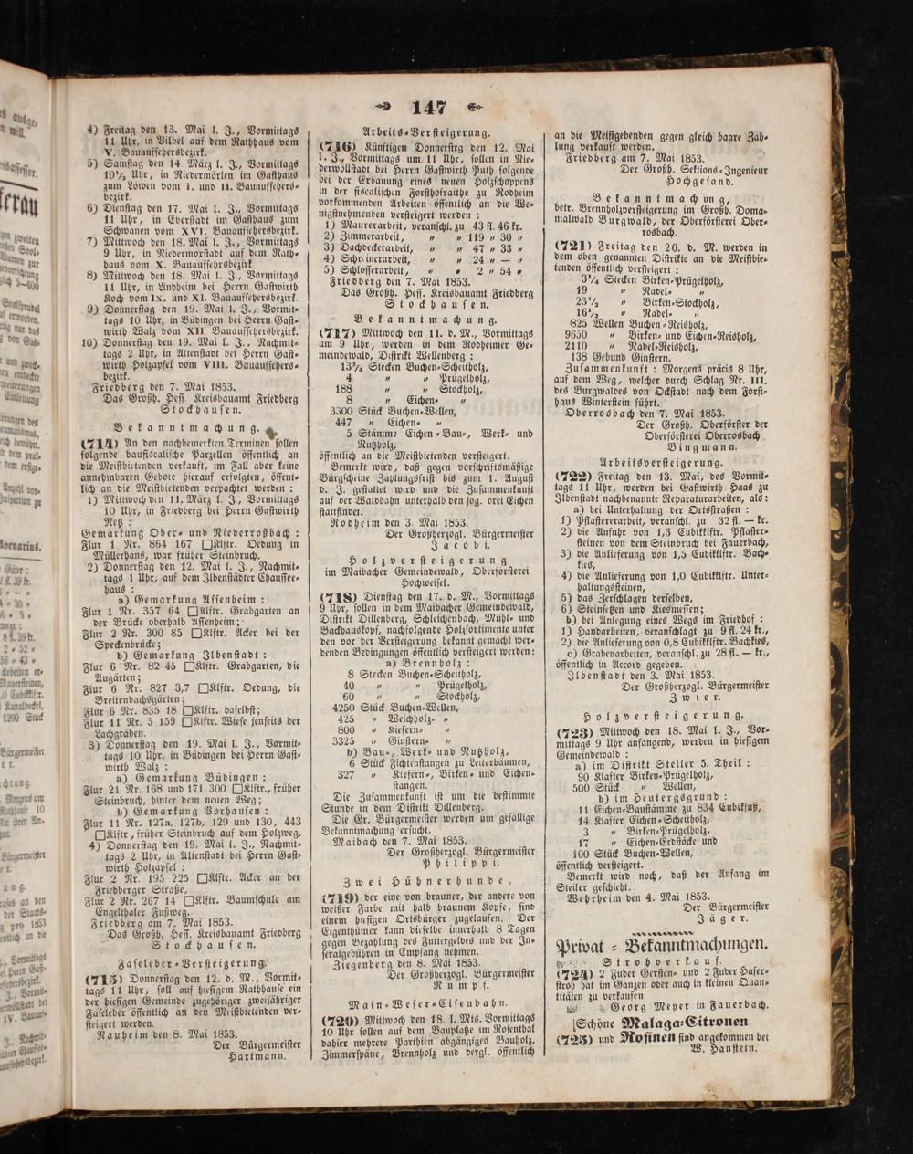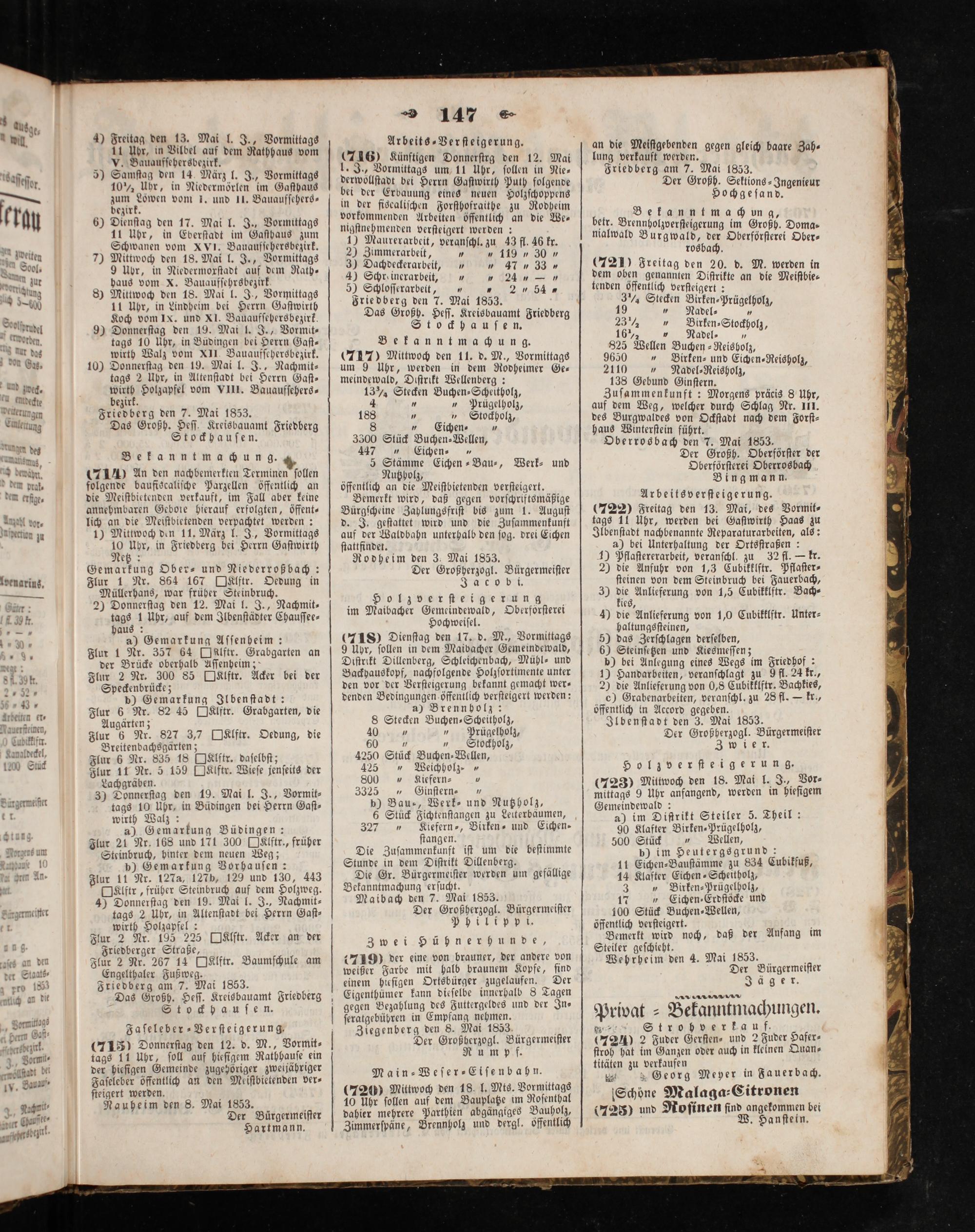 Friedberg den 7. Mai 1853. Das Großh. Heſſ. Kreisbauamt Friedberg Stockhauſen. Bekanntmachung. (717) Mittwoch den 11. d. M., Vormittags um 9 Uhr, werden in dem Rodheimer Ge— meindewald, Diſtrikt Wellenberg: 13% Stecken Buchen-⸗Scheitholz, 4