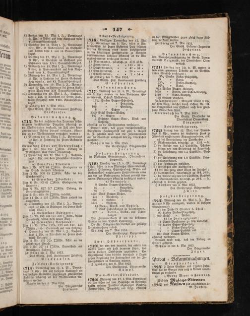 Holzverſteigerung im Maibacher Gemeindewald, Oberforſterei Hochweiſel. (718) Dienſtag den 17. d. M., Vormittags 9 Uhr, ſollen in dem Maibacher Gemeindewald, Diſtrikt Dillenberg, Schleichenbach, Mühl⸗ und Backhauskopf, nachfolgende Holzſortimente unter den vor der Verſteigerung bekannt gemacht wer⸗ denden Bedingungen öffentlich verſteigert werden: a) Brennholz: 8 Stecken Buchen-⸗Scheitholz, 40 5„ Prügelholz, 60 1„ Stockholz, 4250 Stück Buchen⸗Wellen, 425„ Weichholz.„ 800„Kiefern— 1 3325„ Ginſtern⸗„ b) Bau-, Werk⸗ und Nutzholz, 6 Stück Fichtenſtangen zu Leiterbäumen, 327„ Kiefern-, Birken- und Eichen ſtangen. Die Zuſammenkunft iſt um die beſtimmte Stunde in dem Diſtrikt Dillenberg. Die Gr. Bürgermeiſter werden um gefällige Bekanntmachung erſucht. Maibach den 7. Mai 1853. Der Großherzogl. Bürgermeiſter Philippi. Zwei Hühner hunde, 1719 der eine von brauner, der andere von weißer Farbe mit halb braunem Kopfe, find einem hieſigen Ortsbürger zugelaufen. Der Eigenthümer kann dieſelbe innerhalb 8 Tagen gegen Bezahlung des Futtergeldes und der In⸗ ſeratgebühren in Empfang nehmen. Ziegenberg den 8. Mai 1853 Der Großberzogl. Bürgermeiſter Rumpf.