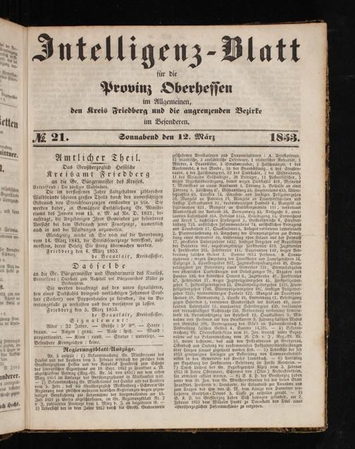 geſchehenen Arreſtationen und Denunnciationen: 4. Arreſtationen. 15 inländiſche, 3 ausländiſche Deſerteure, 1 inländiſcher Refractär, 3 Mörder, 4 Brandſtifter, 3 Straßenräuber, 2 Falſchmünzer, 1 des Raubmords, 4 des Mords, 15 der Brandſtiftung, 6 des Straßen- raubs, 4 der Falſchmünzerei, 82 des Diebſtahls, 2 der Wilddieberei, 11 des Meineids Beſchuldigte, 38 Betrüger, 11 Paßverfälſcher, 5 wegen Majeſtätsbeleidigung, ferner wegen Diebſtahls 419, Meineids 7, Mitwiſſens an einem Raubmord 1, Tödtung 5, Beihülfe an einer Tödtung 1, Fälſchung 47, Mißhandlung 33, Ungehorſams 433, Wider— ſetzlichkeit 60, Exceſſen 74, Straßen- und ſonſtiger Polizeivergehen 59, Mangels an Patenten 19, Mangels an Transportſcheinen und ſonſtige Defraudanten 91, verbotswidrigen Handels 4, Mangels an Ligitimation 621, Mangels an Subſiſtenzmitteln 111, verbotener Wanderſchaft ins Ausland 34, Verwundung 43, Nothzucht 6, uner⸗ laubten Aufenthalts 164, Bettelns 1155, Beleidigung 13, Entweichens aus Arreſt 7, nächtlichen Einſteigens 3, Geiſtesſchwäche 6, Strafver— büßung 753, unſittlichen Zuſammenlebens 74, unſchicklichen Betragens und Trunkenheit 17, Quackſalberei 6, Abſatzes verbotener Lotterielooſe 2, Pfandveräußerung 15, Umgehung der Stempelabgaben zur Betrei— bung eines Gewerbes 10, Entfernung ohne Urlaub aus der Heimath 17, zweckloſen Umherziehens 1432, ſonſtiger Vergehen auf Requiſition der Behörden 901, unzahlungsfähige Forſtfrevler 619, Jagdfrevler 4, Forſtfrevler 265, Feldfrevler 111, Vagabunden 149, wegen Ver⸗ breitung falſchen Geldes 3. Summe 8013 Perſonen. B. Denun⸗ ciationen: wegen Umgehung der Trankſteuer und Zampfgebühren 34, Salzregie 5, Chauſſeegeldes 887, Jagdwaffenpäſſeabgaben 48, Stem— pelabgaben zur Betreibung eines Gewerbes 731, Stempelabgaben von öffentlichen Darſtellungen und Beluſtigungen 78, Abgaben von Hunden 330, des ſtädtiſchen Oetrois 6, Jagdfrevler 46, Forſtfrevler 87, Feldfrevler 27, wegen Jagdpolizeivergehen 45, Forſtpolizeiver— gehen 7, Feldpolizeivergehen 33, Straßenpolizeivergehen 1416, Feuer- polizeivergehen 1746, Sittenpolizeivergehen 181, ſonſtiger Polizeiver— gehen 7321, verbotswidrigen Handels 122, Mangels an Transport- ſcheinen 19, Verwundung 2, Exceſſe 16, Entwendung 11, Beleidigung gegen Behörden 1, verbotener Wanderſchaft ins Ausland 49, uner- laubten Aufenthalts 12, unerlaubten Beherbergens 430, verſäumter und vernachläſſigter Nachtwache 256, Verbreitung verbotener Lotterie— looſe 14, Beeinträchtigung der Briefpoſt 13, Quackſalberei 9, Mit⸗ nahme von Perſonen auf dem Briefkarren 9, Führung falſchen Maßes und Gewichts 399, Verweigerung des Viſa's im Patrouillenbuch 1, Verbreitung falſchen Geldes 4, Summe 14,395.— 4) Bekannt⸗ machung Gr. Oberpoſtinſpektion vom 31. Jan. wonach unter Bezug⸗ nahme auf die Bekanntmachung vom 28. Okt. v. J, Reg.-Bl. Nr. 53, weiter beſtimmt, daß auch den Poſthaltereien zu Großgerau, Offenbach und Dieburg die vorkommenden Poſthaltereidienſtleiſtungen über Langen hinaus zugetheilt worden ſind.— 5) Ueberſicht der für 1853 genehmigten Umlagen zur Beſtreitung von Communalbedürf⸗ niſſen in den Gemeinden des Kreiſes Lauterbach.— 6) Ausſchlag zur Bezahlung der Forſtwarten-Beſoldung im Forſte Reinheim.— 7) Diüurch Urtheil des Gr. Bezirksgerichts Alzey vom 3. Februar 1853 iſt Anton Oſtermaier, Schreiner von(Ober) Niederfloͤrsheim, für abweſend erklärt worden.— 8) S. K. H. der Großherzog haben unter dem 30. Jan. dem Gr. Miniſterreſidenten bei der freien Stadt Frankfurt, Freiherrn v. Leonhardi, die Erlaubniß zur Annahme und zum Tragen des ihm von S. M. dem Könige von Hannover ver⸗ liehenen Guelphen-Ordens 3. Claſſe zu ertheilen geruht.— 9) S. K. H. der Großherzog haben Sich bewogen gefunden, am 2. Februar 1853 dem Wilhelm Hundt zu Darmſtadt den Titel eines „Großherzoglichen Hofcommiſſärs“ zu entziehen.