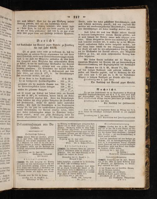 Mittwoch den 13. d. M., Abends 7½ Uhr, auf dem hieſigen Rathhauſe recht zahlreich einfinden zu wollen und bemerken zugleich, daß die Rechnung für das Jahr 1852 vom 7. bis zum 14. d. M. bei Rathsdiener Wagner in hieſigem Rathhauſe zur Einſicht offen liegt. Friedberg den 2. Juli 1853. Der Ausſchuß des Vereins gegen Bettelei.