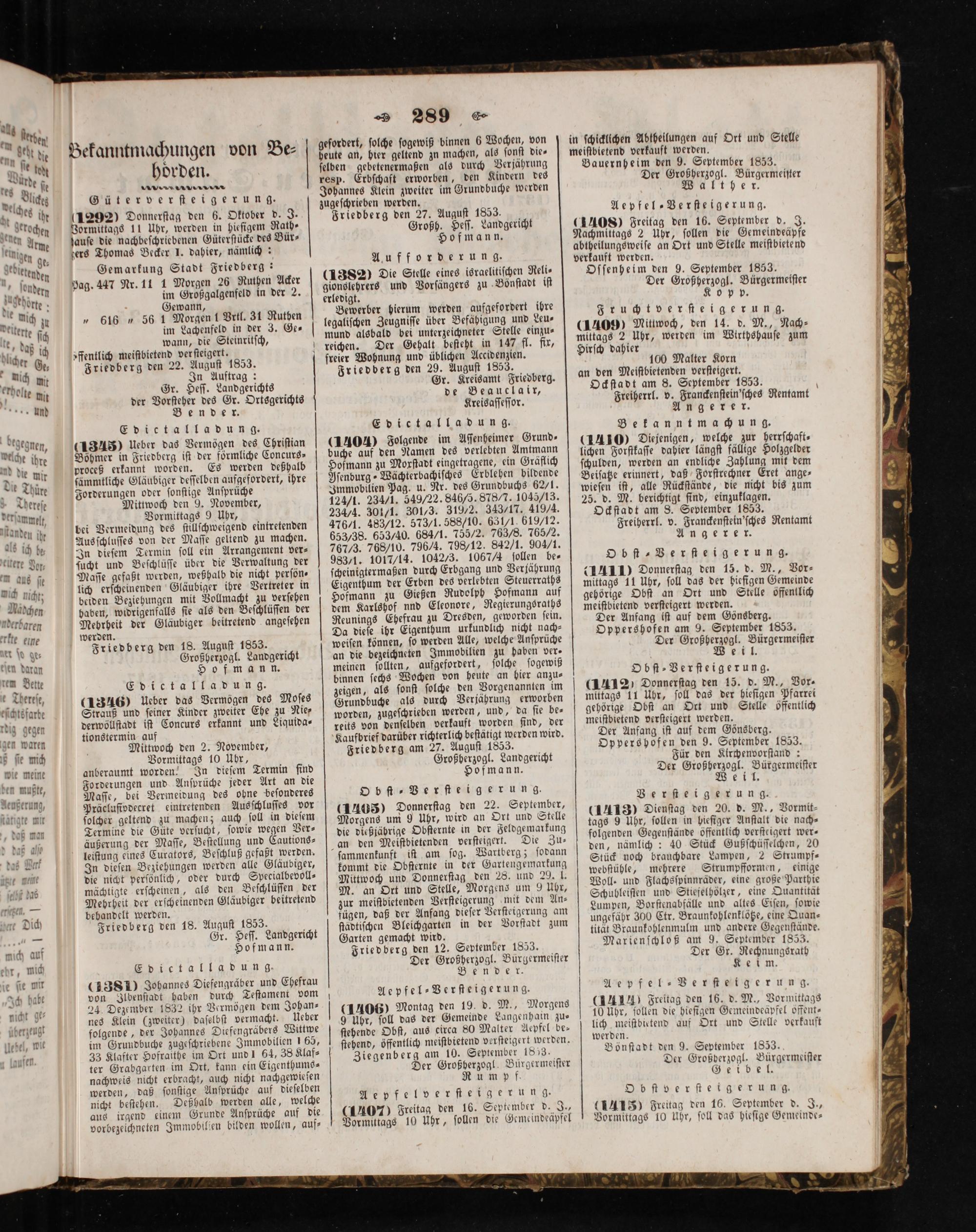 (1405) Donnerſtag den 22. September, Morgens um 9 Uhr, wird an Ort und Stelle die dießjährige Obſternte in der Feldgemarkung Die Zu⸗ ſammenkunft iſt am ſog. Wartberg; ſodann kommt die Obſternte in der Gartengemarkung Mittwoch und Donnerſtag den 28. und 29. l. M. an Ort und Stelle, Morgens um 9 Uhr, zur meiſtbietenden Verſteigerung mit dem An⸗ fügen, daß der Anfang dieſer Verſteigerung am ſtädtiſchen Bleichgarten in der Vorſtadt zum Garten gemacht wird. Friedberg den 12. September 1853. Der Großherzogl. Bürgermeiſter Bender.