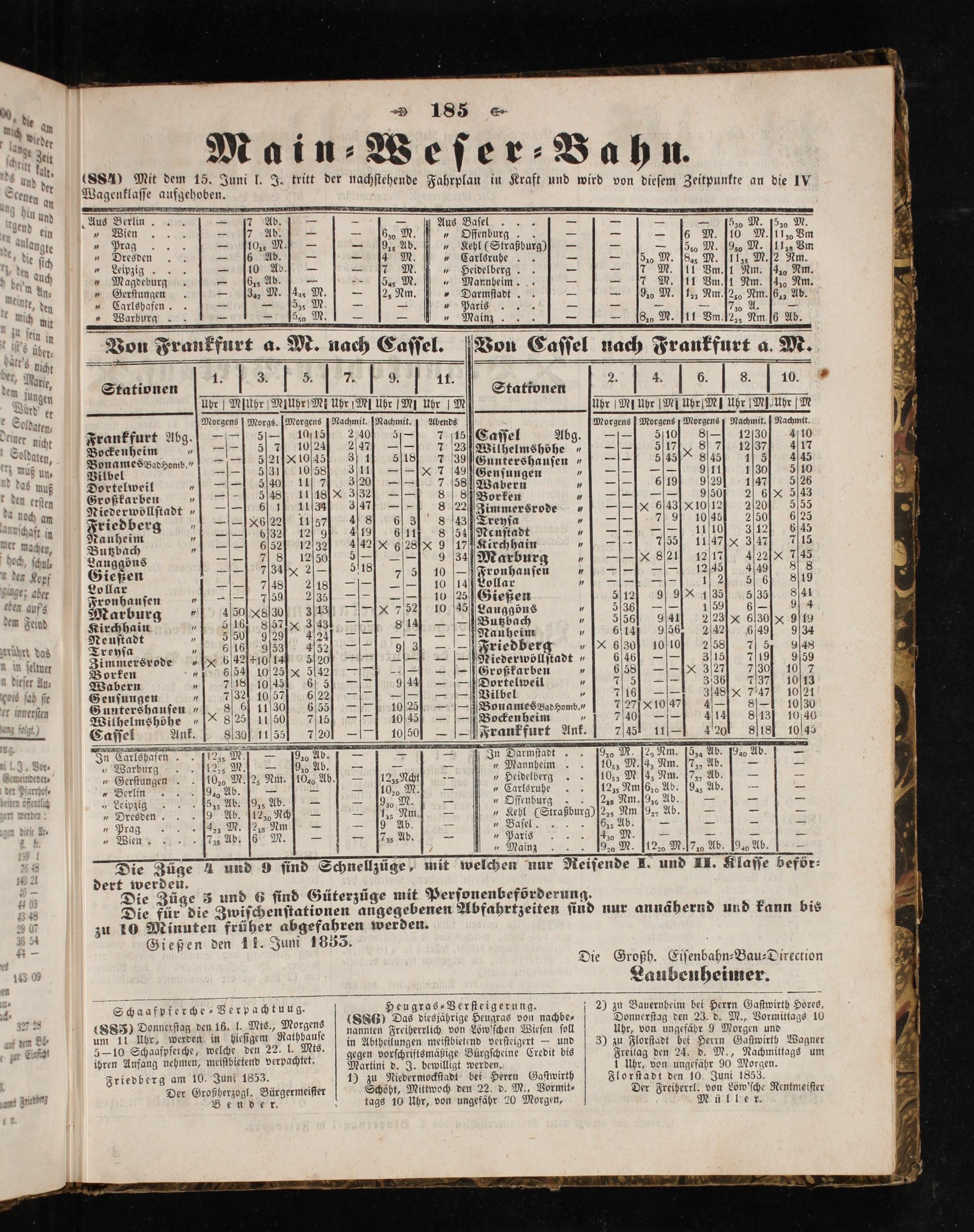 enen an in und i 5 Aus Berlin— 17 Ab— dug ein„ Wien 7 Abe 5 17 Aus Baſel—. f Aon, 5 8—— 6 0 O b. 530 M. 530 M. angte r 3 8 2 30„ ffenburg.. 8— 2 die ſſch„ Dresden 155 W 2 170 45 955„ Ae——* 5. 7 95 5 50 5 50 1 Leipzi 0.„ Car 8——* 5. den auch N Mage 9 e— 7 M. Heddelber 10— 85 eee . Magdeburg— ds Ab.— 5% M 10 7 M. 1 Im. 1 Nm. 4 Nm An- 17 Ger 1 4 3⁴⁸ 5 15 Mannheim 9 5 5 M 5 a 14 a 1 tungen 3% M. 4% M.“— 2, Nm 7 M. 11 Um. 1 Nm. 41 Nm. Ak, den„ Carlshafen.—— 5358 M— 1 10 2, Waanſtadt—(07e M. 1, Nm. 2 Nm. J 3s M. 25 b 22 250 Nm. 6.2 Ab. ch nit burg— Ie M. 1— Main 5 2 1 8— 1J1272⁰ 2 250 1 I., Dam e N. I n Iz in le Ab „ein in— 5 1225. üer Von Frankfurt a. M. nach Caſſel. Von Caſſel nach Frankfur 4 nicht 5— P 0 ran furt d. M. 1 arte N 1 1. 1 8 * Stationen N 7˙ 9. 11. Stattonen 2. 4. 6.[ 8.10. N Uhr Mſühr Miühr Mi Uhr M] Uhr MI Uhr M Abr M br MI Ooldaten⸗ a Morgens] Morgs.] Morgens JNachmit.]Nachmit. 4 Abends— En n 2 einer nicht Frankfurt Abg. 5 1005 240 57 855 7 15 C 1 Morgens] Morgens] Morgens Nachmit.] Nachmit. 8 eeaem, e e ee e e 23 441 Abg. I%% S 120 40 Bonames Bad domb.,= Si] 3% sf 7 3800 ilhelmshöhe„[= 5K 8 267] 417 Vilbel dome.“]—— 531 10588 3%]—[[& 749 Guntershauſen„[= 540 84% 1] 445 Dortelweil„ 00 17 300—= 7.58 5 2 19„ ien 130 30 Großkarben„ 548] 100K[-- 8 8 Ken„= 9,29] 10470 5/25 Niederwöllſtadt] 6 1 110] 3,—[ 8 22 e ebe„. e 2,6/X& 5/33 Nie 90 5 2 Zimmersrode[-=I 64301012] 2200 5/55 Friedberg„ eff 17 48 J 43 Treyſa„= 7104] 2ʃ500 6925 Nauheim„= esel 12% 4% 61 8 54 Nenſtadt„ 10 3 124 6 15 Butzbach„== 123% 4%& 6ſ 2s 9 17 Kirchhain„ 455] 1107] K 3047] 715 Langgöns— I Sf 1256 5-H= 9 34 Marb 17 5 Lollar e ee e e 0 e ee 4 36 809 —— ollar ee e eee „ e Gießen 32 9 80 1 9055 5 1 1 4 50 S830 3(13[& 752 10 45 Langgöns„ 5350—— I 45 32 9 4 irchhain 1 5 161 8057 3]431-f ö 2 55 5 7 Neuſtadt„680 9% 4 l Nunheßt e 1 2 2⁴———[Nauheim„ 6114 9056 2042 6.49 9.34 Art das Treyſa„ 616] 90534 44524—— 9 34——[Friedber A 65 7 ſeltne Jimmersrode» 64200144 5200—— 2 85 8 0 6%0 100% 2/58] 7 848 . Borken„ 654 10.25* 5424—.— 82——[PNiederwollſtadt, 646ʃ—— 315] 719] 959 eſer Au⸗ Wabern 1 7118 10445 6 A 1—— Großkarben* 6581—-I 3027 7301 10 7 b ſah ſie Genſungen e e e eee DN e 3360 737 1013 unerſten Guntershauſen„86 1130 655— ab Be 7 710% 247 101 n Wilhelmshöhe„ 825 1150 715 f 10 15 eee 14 85 1075 6 8010030 Taff 9 0 185— e 0, 7— 1 41 80131 10040 — 8420 115 220 J 10 00 Frankfurt Ant. 2 fs 1 420 stel 1005 g In Tarlshafen F 9 e—— 5 per⸗„8 8 8 74 5 10 Ab. 57*„ annheim M.[a, Nm. 73, Ab.—— —— 5 8 20 N 9425 25 1 104 Ab.]— 123 Ncht—„ Heidelberg.. 1053 M 15 Nm. 77 Ab.— 1 ful„ ig 600. Jg A. i e ee, eee, 12, Nm: Ab. 9. Ab.“—— „ Dresden. 9! Ab. 1% N.— 11e Nu nac, Offenburg. 21 Nm. Ab.“—:—— 5 5 3. M 5 9 20— 1 1 5 Am 97 Ab.———— 14 8 e 8 15 N 7„ Baſel. 5 Ab.—— 1— „ Wien 7 Abt e M.— ir F, e ess 4% M.“* 2* Tie Ji 7 2 5„ Mainz. 192 M. 120 M. 710 Ab. 940 Ab. 0 1 5 werden T und 5 ſind Schnellzüge, mit welchen nur Neiſende I. und II. Klaſſe beför⸗ 1 85 Fursdie Zwiſch 55„ e Tee 3 48 ie für die Zwiſchenſtationen angegebenen Abfahrtzeiten ſind nur ann 2 1 7 2 72 nahe 8 a zu 10 Minuten früher abgefahren werden. g g bernd und kann bis 4— Gießen den 11. Juni 1835. 133 09 Die Großh. Eiſenbahn⸗Bau⸗Direction . Laubenheimer. Schaafpferche-Verpachtuug. Heugras-Verſteigerung 2 N i. 5 8 N E. J. zu Bauernheim bei Herrn Gaſtwirth S 2 2(885) Donnerſtag den 16. l. Ms., Morgens(S886) Das diesjährige Heugras von nachbe⸗ Donnerſtag den 23 d. e 10 dem Ol⸗ um 11 Ubr, werden in hieſigem Rathhauſe nannten Freiherrlich von Löw'ſchen Wieſen ſoll Uhr, von ungefähr 9 Morgen und 5 u Einſich 5—10 Schaafpferche, welche den 22. l. Mts. in Abtheilungen meiſtbietend verſteigert T und 3) zu Florſtadt bei Herrn Gaſtwirtb Wagner ihren Anfang nehmen, meiſtbietend verpachtet. e e e Bürgſcheine Credit bis Freilag den 24. d. M., Nachmittags um 10. gt w 15 5* 5 1 Friedberg am 10. Juni 1853. 1) zu Ade ver Hirte Gaſtwirth 81 9a ende 90 11. zrerbeng 9 z ü i öbt, Mi 0 N rſtadt den Juni 1853. i rein Der Großherzogl. Bürgermeiſter Schöbht, Mittwoch den 22. d. M., Vormit⸗ Der Freiherrl. von Löw'ſche Rentmeifter