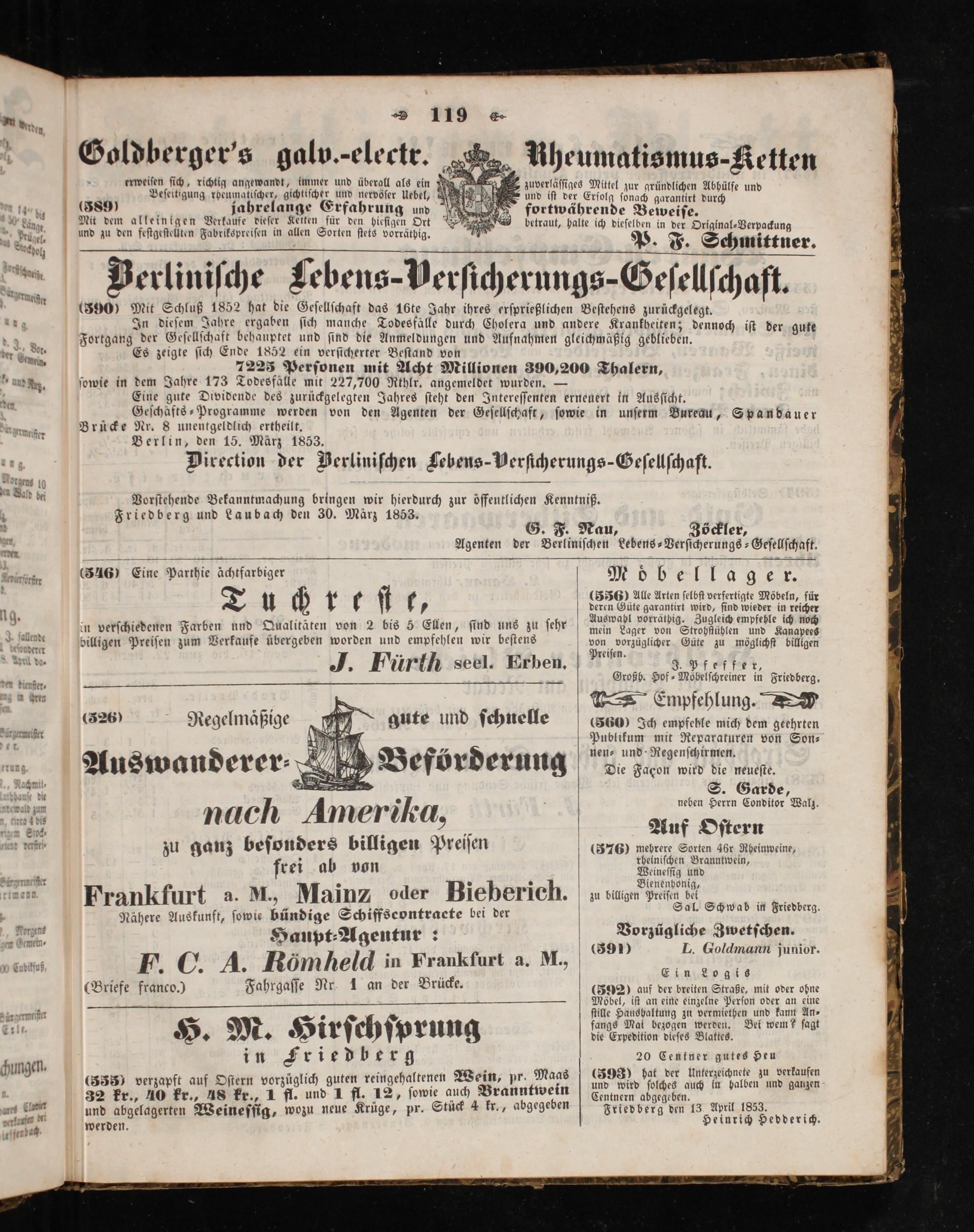 Vorſtehende Bekanntmachung bringen wir hierdurch zur öffentlichen Kenntniß. Friedberg und Laubach den 30. März 1853. G. F. Nau, Zöckler,