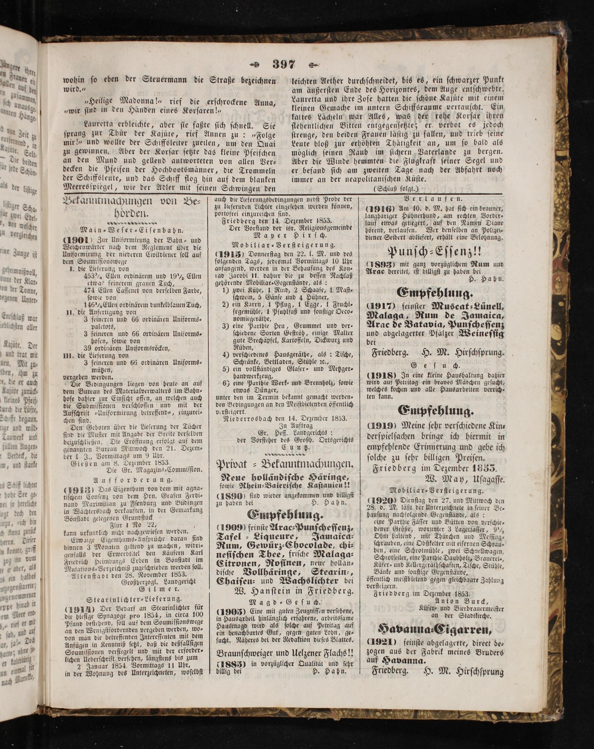 4919) Meine ſehr verſchiedene Kin— derſpielſachen bringe ich hiermit in empfehlende Erinnerung und gebe ich ſolche zu ſehr billigen Preiſen. Friedberg im Dezember 1833. W. May, Uſagaſſe. Mobiliar-⸗Verſteigerung. (1920 Dienſtag den 27. und Mittwoch den 28. d. M. läßt der Unterzeichnete in ſeiner Be— hauſung nachfolgende Gegenſtände, als: eine Parthie Fäſſer und Bütten von verſchie⸗ dener Größe, worunter 3 Lagerfaſſer, 9½ Ohm haltend, mit Thürchen und Meſſing⸗ ſchrauben, eine Obſtkelter mit eiſernen Schrau— ben, eine Schrotmühle, zwei Schnellwagen, Schrotſeiler, eine Parthie Daubholz, Brauerei, Küfer⸗ und Kellergeräthſchaften, Tiſche, Stühle, Bänke und ſonſtige Gegenſtände, öffentlich meiſtbietend gegen gleichbaare Zahlung verſteigern. Friedberg im Dezember 1853. Anton Burck, Küfer⸗ und Bierbrauermeiſter an der Stadtkirche.