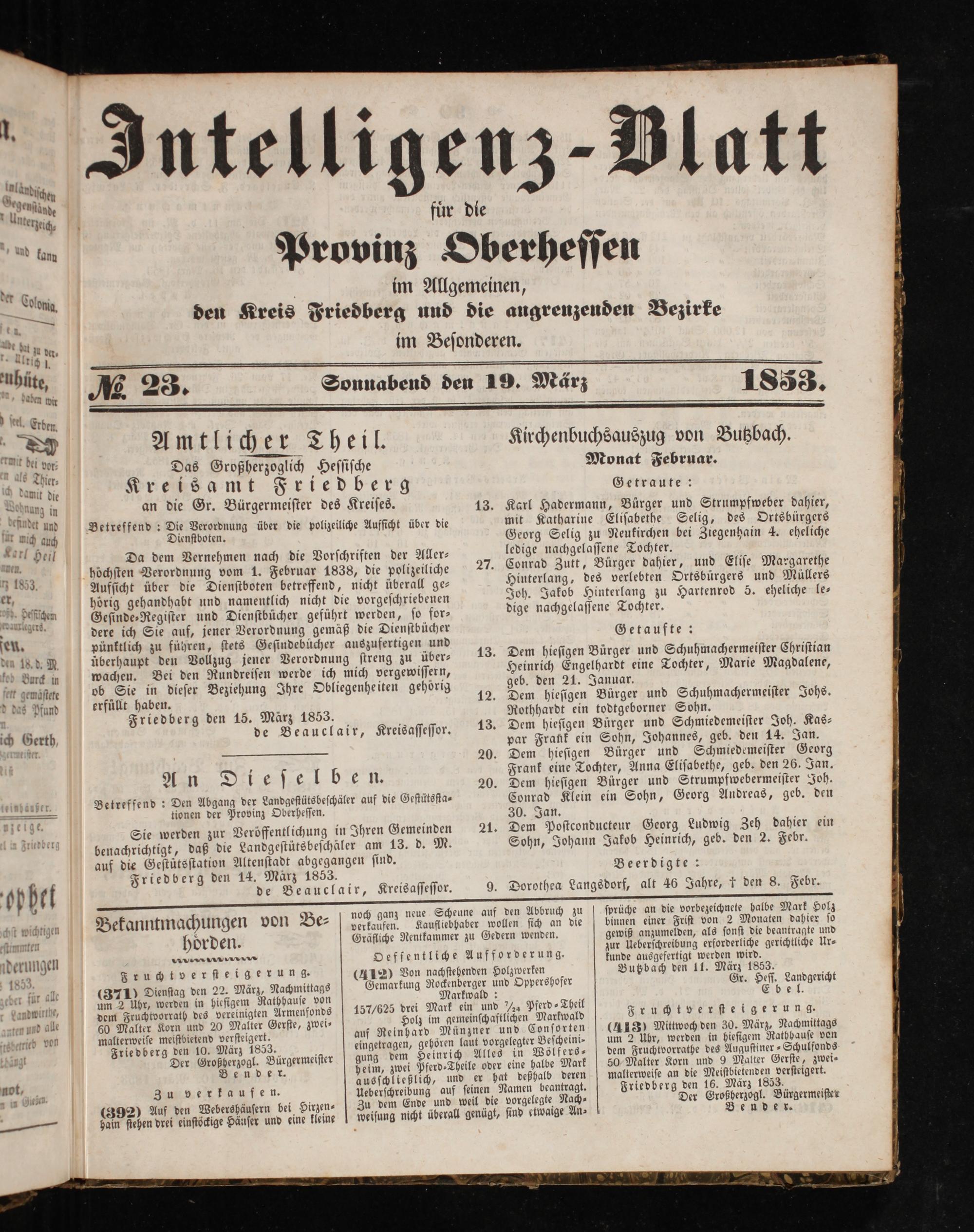 gewiß anzumelden, als ſonſt die beantragte und zur Ueberſchreibung erforderliche gerichtliche Ur⸗ kunde ausgefertigt werden wird. Butzbach den 11. März 1853. Gr. Heſſ. Landgericht Ebel. Fruchtverſteigerung. (413) Mittwoch den 30. März, Nachmittags um 2 Uhr, werden in hieſigem Rathhauſe von dem Fruchtvorrathe des Auguſtiner-⸗Schulfonds 50 Malter Korn und 9 Malter Gerſte, zwei⸗ malterweiſe an die Meiſtbietenden verſteigert. Friedberg den 16. März 1853. Der Großberzogl. Bürgermeiſten Bender.
