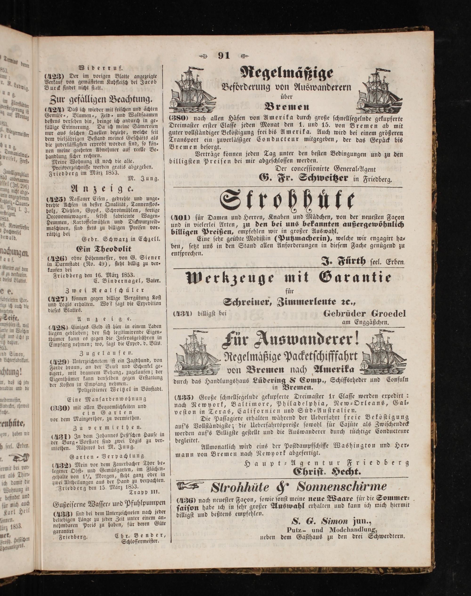 Die Paſſagiere erhalten während der Ueberfahrt freie Beköſtigung auf's Vollſtändigſte; die Ueberfahrtspreiße ſowohl für Cajüte als Zwiſchendeck werden auf's Billigſte geſtellt und die Auswanderer durch tüchtige Conducteure begleitet.