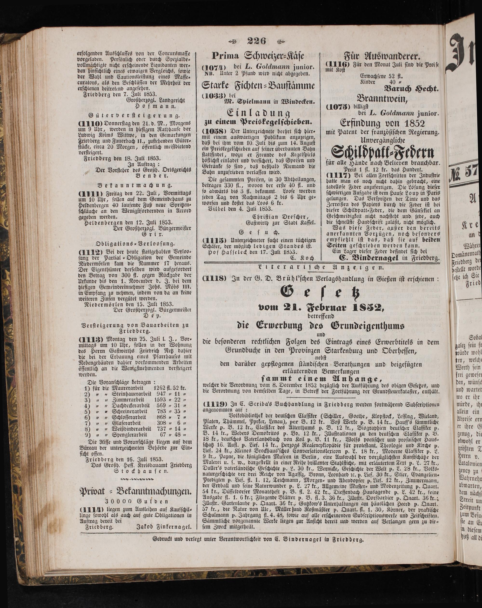 Gedruckt und verlegt unter Verantwortlichkeit von C. Bindernagel in Friedberg.