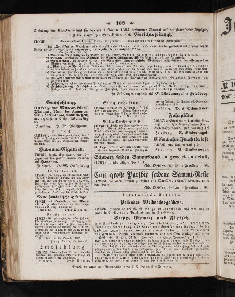 Gedruckt und verlegt unter Verantwortlichkeit von C. Bindernagel in Friedberg.